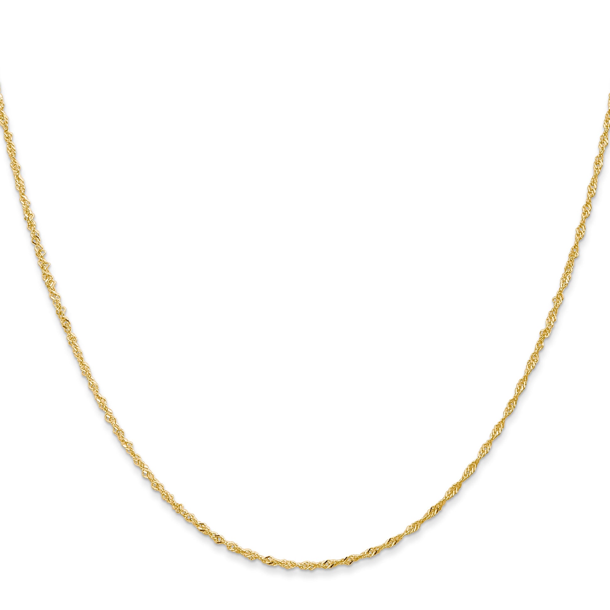The 24 Inch 14K 1mm Singapore Chain with Lobster Clasp is a stunning piece of fine jewelry. Crafted from high-quality 14K gold, this polished necklace features a delicate 1mm width that adds a touch of elegance to any outfit. The classic Singapore chain design ensures durability while offering a sophisticated look. Measuring 24 inches, it drapes beautifully, perfect for layering or showcasing a pendant. The lobster clasp provides secure fastening and convenient wear. Nickel-free and machine-made, this chain promises lasting shine and comes with a lifetime guarantee. The 24 Inch 14K 1mm Singapore Chain with Lobster Clasp is a timeless addition to any jewelry collection.
