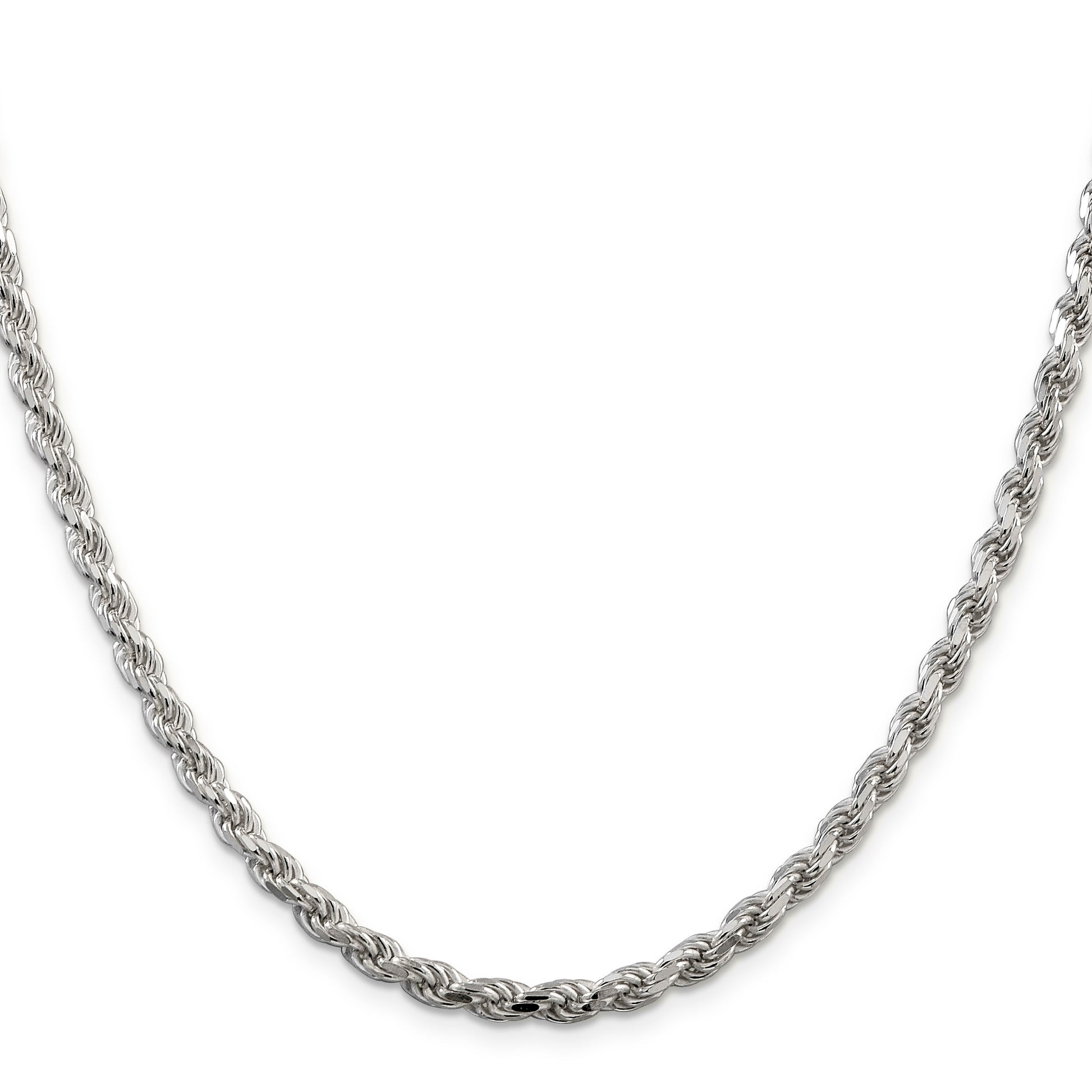The 24 Inch Sterling Silver 4.25mm Diamond-Cut Rope Chain is a stunning piece for any jewelry collection. Crafted from high-quality 925 sterling silver, this necklace boasts a polished finish that catches the light beautifully. With its solid, diamond-cut texture, the chain shimmers elegantly on your neck. The anti-tarnish coating preserves its shine, ensuring it remains a treasured accessory for years to come. Measuring 24 inches long and 4.25 mm wide, it is perfectly sized for versatile wear, and the lobster clasp provides secure closure. The chain's classic rope style is ideal for adding a touch of elegance to any outfit.