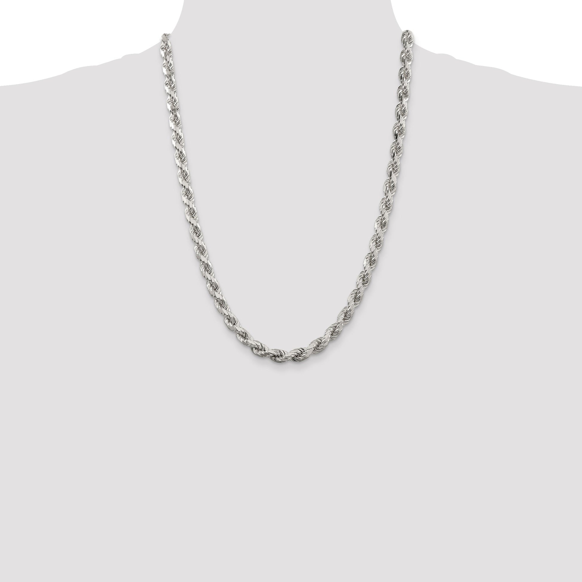The 24 Inch Sterling Silver 6.5mm Diamond-Cut Rope Chain is a standout piece of fine jewelry, crafted with precision for the discerning man. Made from 925 sterling silver, this polished chain shines brightly, thanks to its diamond-cut texture. Its solid and sturdy build promises lasting wear, while the anti-tarnish coating keeps it looking new over time. The 24-inch length fits comfortably, making it perfect for any occasion. Secure it with ease using the lobster clasp, and enjoy the premium quality and timeless style of this stunning rope chain.