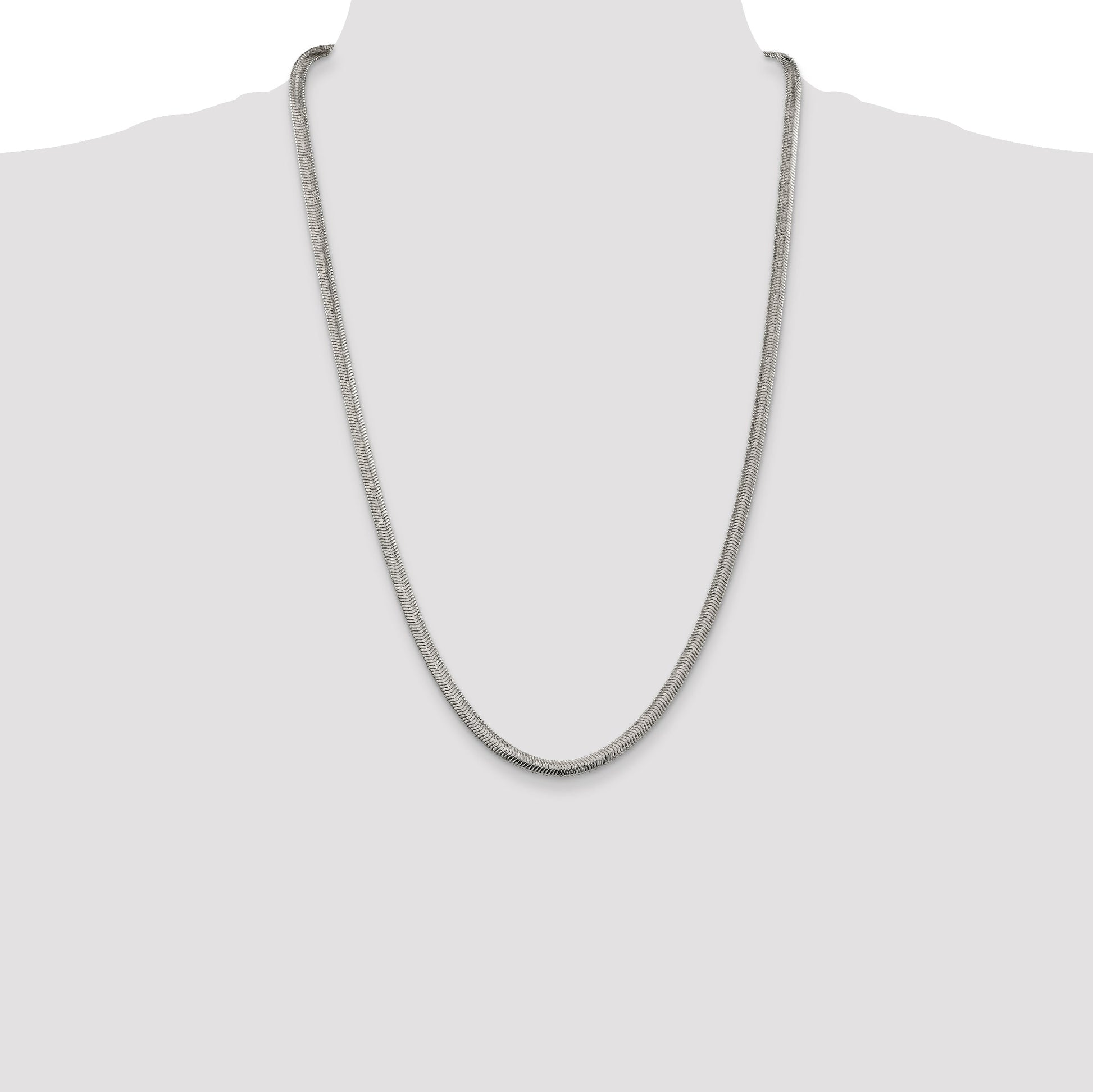 The 26 Inch Sterling Silver 4.2mm Flat Oval Snake Chain exudes elegance and timeless style. This women's necklace features a polished, solid sterling silver design, giving it a sleek finish that catches the light beautifully. The 4.2mm chain showcases a unique flat oval profile, offering a modern twist on the classic snake chain style. At 26 inches long, it drapes gracefully around the neck. The lobster clasp ensures secure wear, while the high-quality 925 sterling silver guarantees durability. This exquisite piece is perfect for adding a touch of refined luxury to any outfit. Indulge in the sophistication of the 26 Inch Sterling Silver 4.2mm Flat Oval Snake Chain.