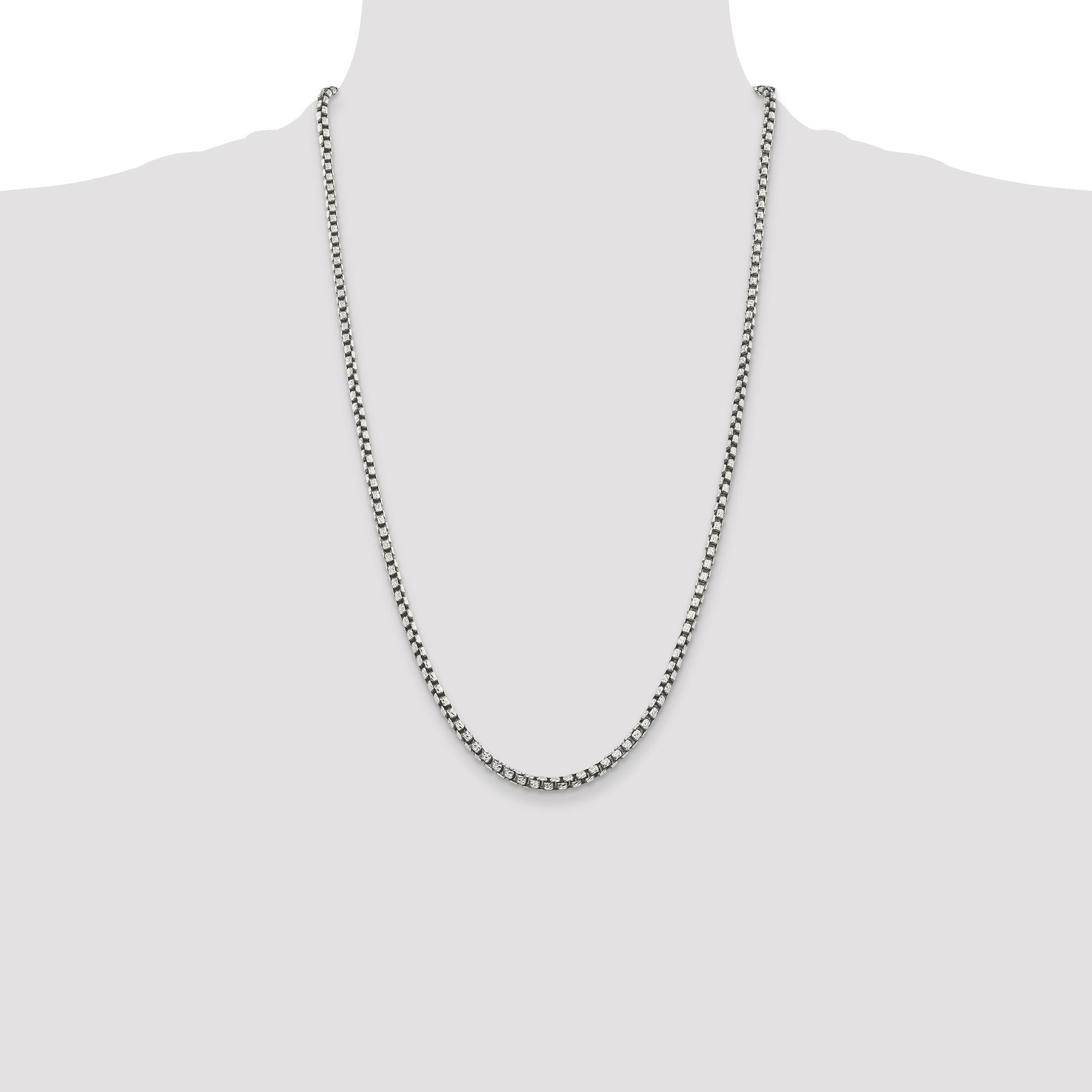 The 26 Inch Sterling Silver Antiqued 3.5mm D/C Round Box Chain adds a bold touch to any look. Crafted from 925 sterling silver, this necklace showcases an antiqued finish for a timeless appeal. The 26-inch length and 3.5mm width offer standout style. Its solid design ensures durability, and a lobster clasp adds security. The diamond-cut texture and round profile elevate its elegance, making it perfect for dressing up or down. Made for men, this machine-made jewelry piece shows off a cool, white hue, ensuring you stand out in any crowd.