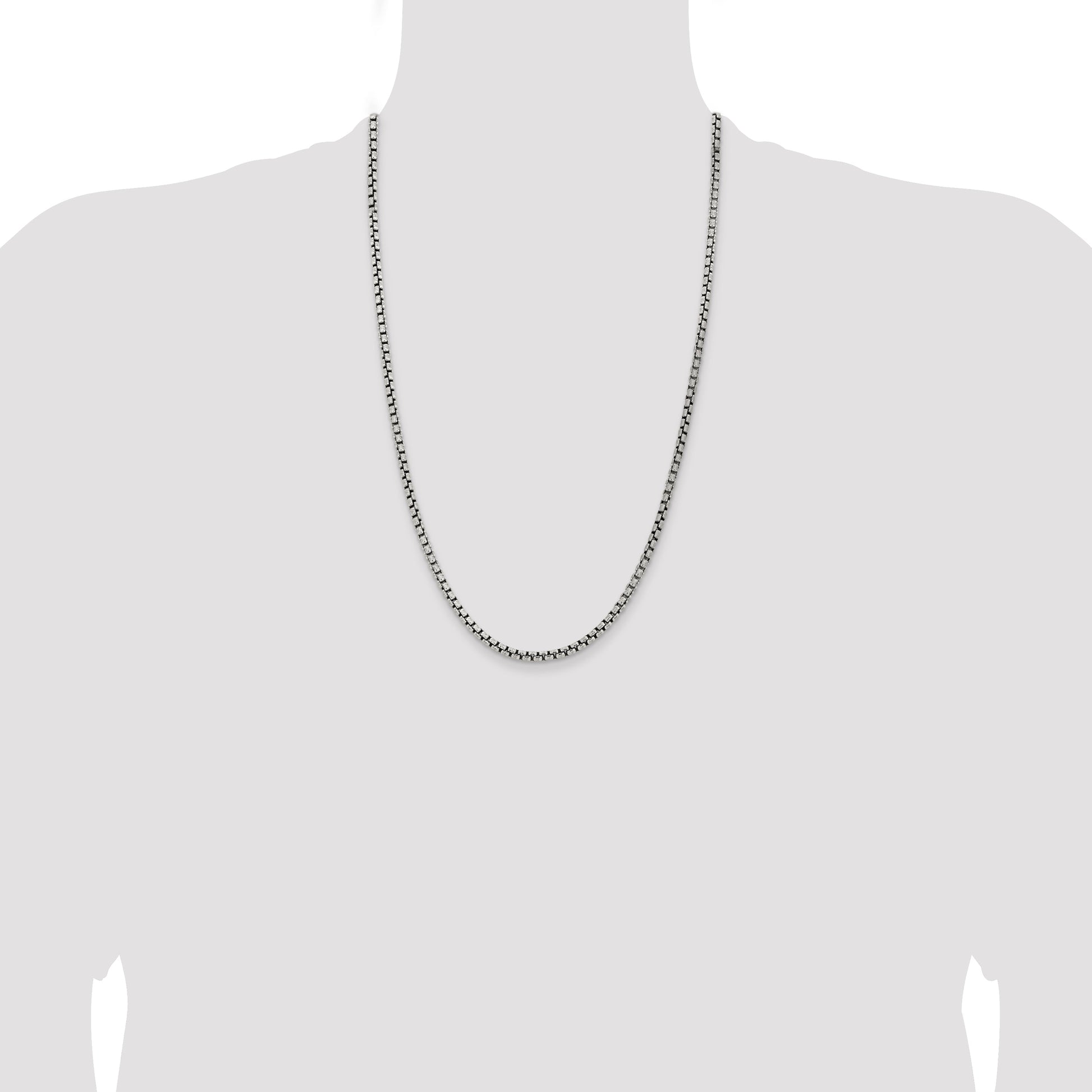 The 26 Inch Sterling Silver Antiqued 3.6mm Round Box Chain is a stunning tribute to timeless elegance. Crafted from 925 sterling silver, this unisex chain features a polished and antiqued finish that adds a unique flair to any outfit. Measuring 26 inches in length, the chain's 3.6mm width creates a bold yet sophisticated look, making it perfect for featuring your favorite pendant or wearing alone. The sturdy lobster clasp offers ease and security. Machine-made for superior quality, this necklace combines style with enduring craftsmanship. Embrace the sophistication of the 26 Inch Sterling Silver Antiqued Box Chain today.