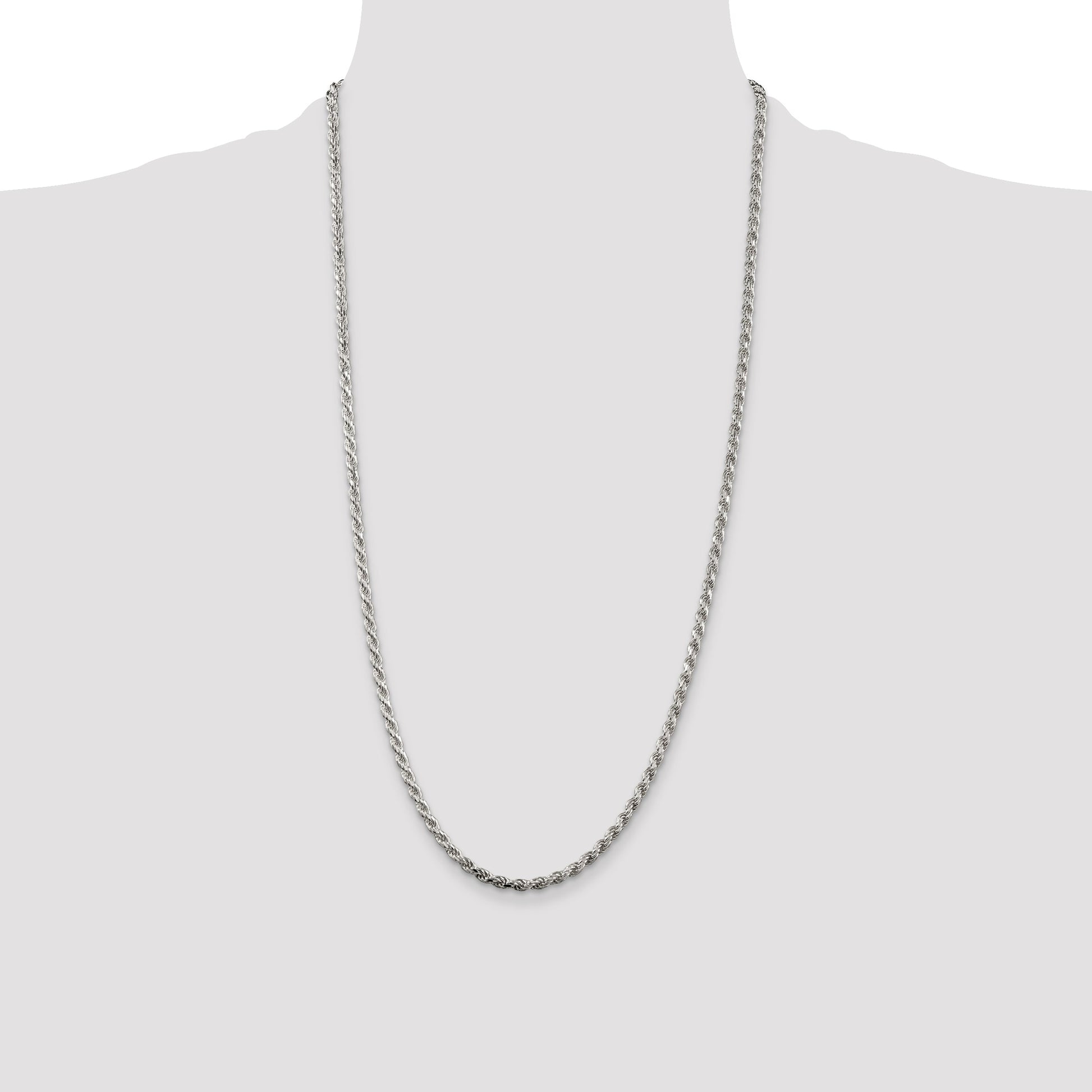 The 28 Inch Sterling Silver Rhodium-Plated 3.2mm Diamond-Cut Rope Chain is a stunning piece of fine jewelry that every woman will adore. Crafted with 925 sterling silver and finished with a radiant rhodium-plating, it offers a polished, silver-tone shine that enhances any outfit. This solid, casted chain showcases a classic rope design with a 3.2mm width and features an elegant diamond-cut texture. A secure lobster clasp ensures it stays safely in place. The timeless appeal of the 28 Inch Sterling Silver Rhodium-Plated 3.2mm Diamond-Cut Rope Chain makes it a must-have for every jewelry aficionado.