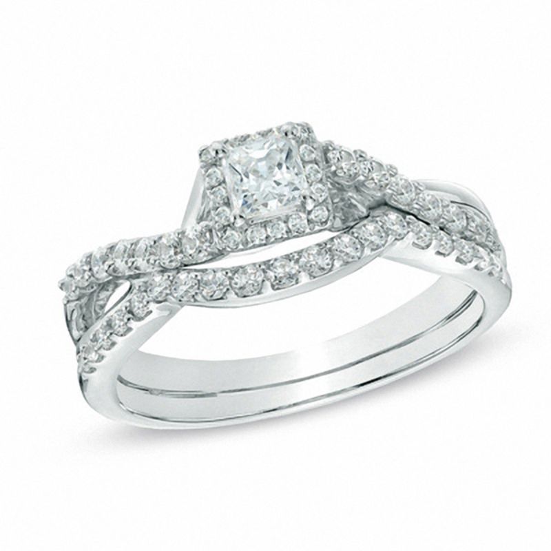 Manufactured in 14K white gold, this bridal engagement ring set features a 1/3 ct. princess-cut diamond center stone bordered with a halo frame of smaller round accent diamonds. Polished and diamond-lined ribbons create the ring's cleverly twisting shank. All diamonds on this bridal set are natural and earth mined.