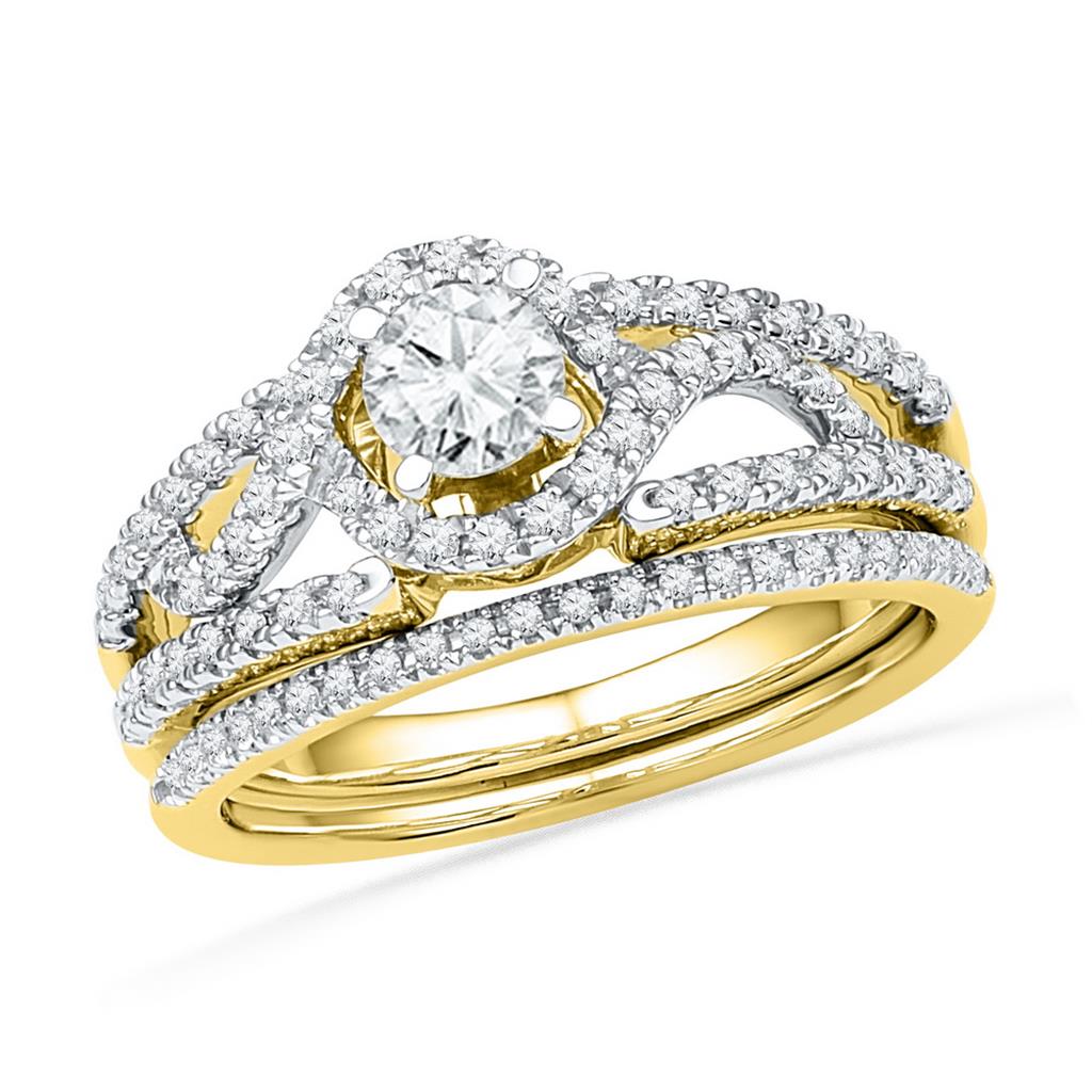 Introducing our stunning 3/4 carat total weight diamond 1/3 carat CRD Bliss bridal set, featuring a beautiful single halo design. This set is crafted in 14kt yellow gold and weighs approximately 6.58032 grams. The total gemstone carat weight is 3/4, with the primary gem weighing 0.75 carats, while there are no gem 2 or gem 3 carat weights. Enjoy the intricate and elegant beauty of this amazing bridal set.