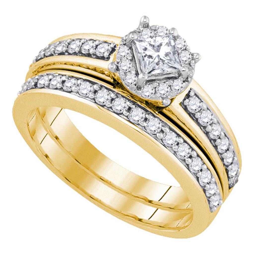 This is a certified 3/4 carat diamond bridal set made of 14kt yellow gold, weighing approximately 6.33 grams. The princess-cut primary diamond has a G-H color and I1 clarity and...