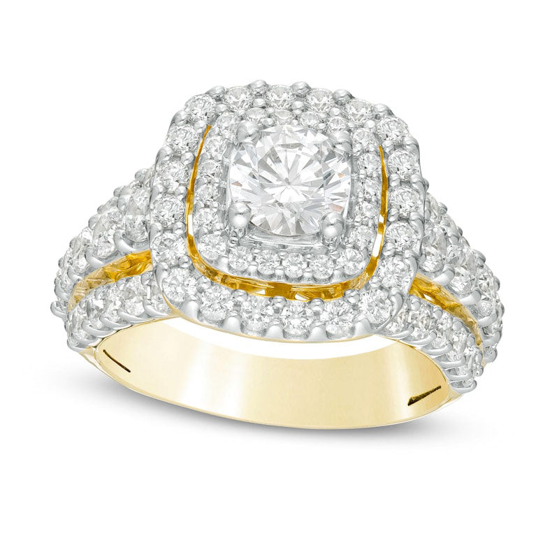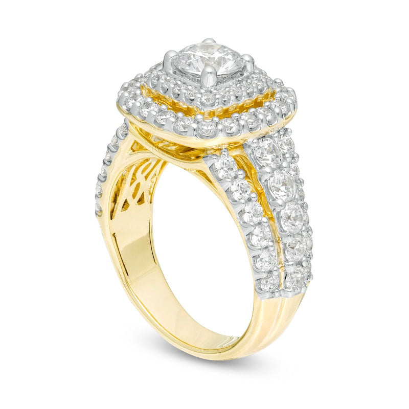 This stunning engagement ring boasts an impressive 3 cts. t.w. of diamonds, radiating with the love that you share. Crafted in 14K gold, it features a breathtaking 1 ct. diamond encased in two cushion-shaped frames dotted with smaller diamonds. The split shank shines brilliantly with a row of graduated-sized diamonds, the largest of which are 1/10 ct. each, surrounded by smaller diamonds. With its outstanding sparkle and impeccable polish, this engagement ring is a true token of your affection, and is sure to make her feel truly special.