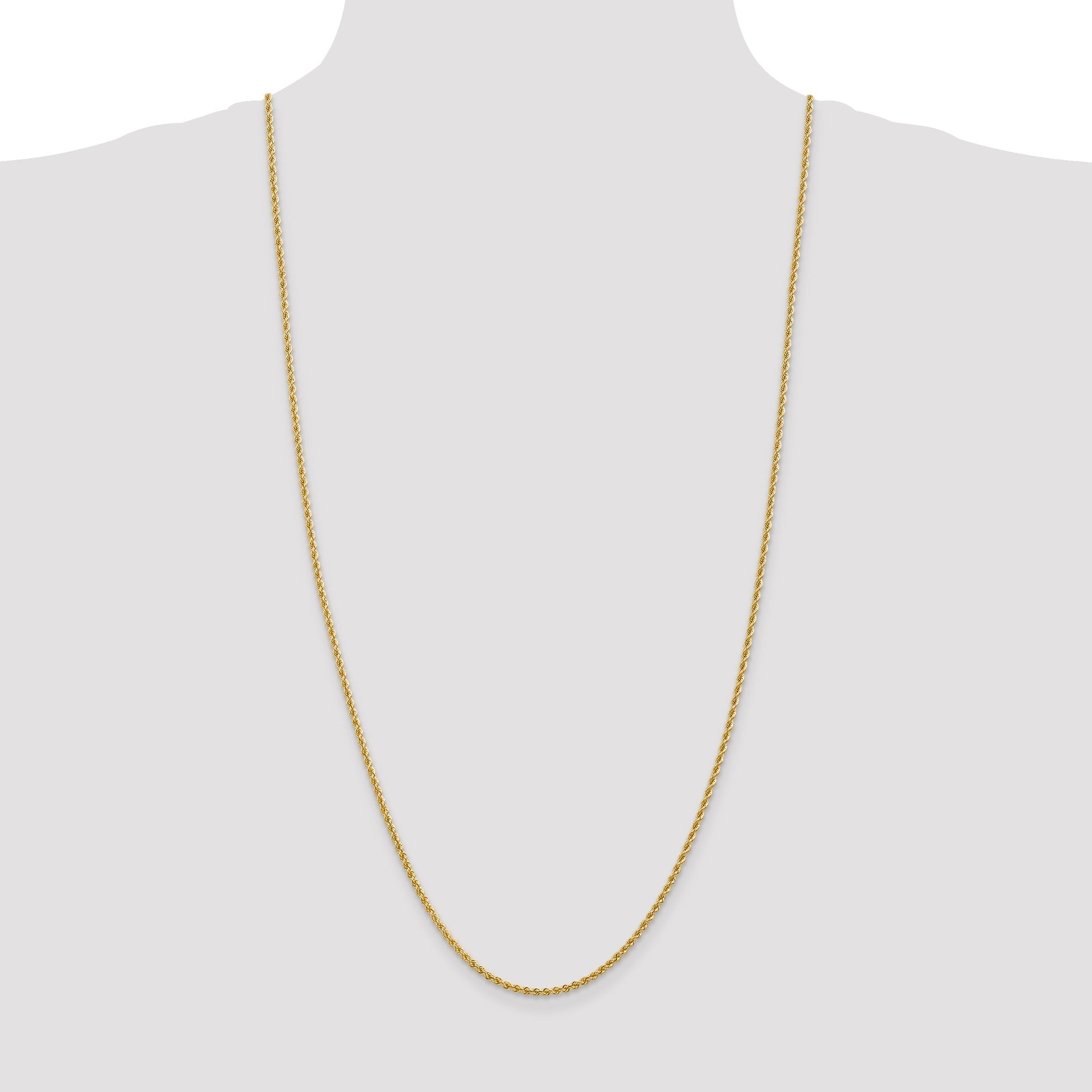 Introducing the stunning 30 Inch 14K 2.25mm Solid Regular Rope Chain, a true classic in fine jewelry. Crafted from premium 14K yellow gold, this polished rope chain exudes elegance with its 30-inch length and 2.25mm width. The solid construction ensures lasting durability, while the lobster clasp provides secure wear. Each link is carefully extruded and wire-formed, contributing to its sleek appearance. Ideal for any occasion, the 30 Inch 14K 2.25mm Solid Regular Rope Chain offers timeless style and reliable quality that promises to complement any ensemble.