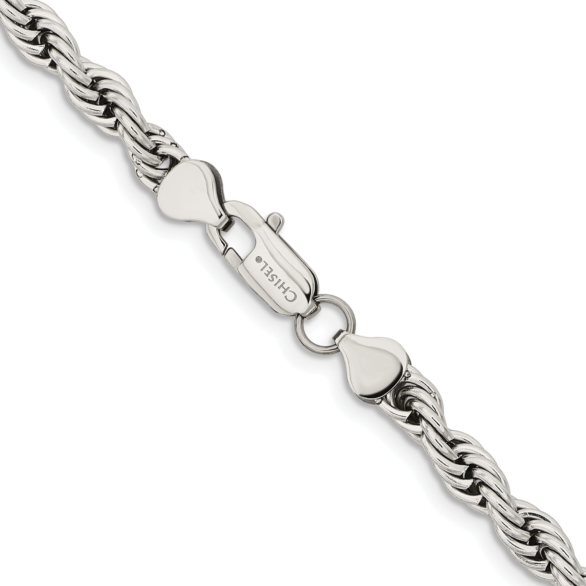 Discover the timeless allure of the 30 Inch Chisel Stainless Steel Polished 6mm Rope Chain. Crafted with precision, this sleek chain boasts a shiny finish that captures attention. Its 30-inch length and 6mm width make it a versatile piece that suits any style. The durable stainless steel material ensures lasting quality, while the fancy lobster clasp provides secure wear. Perfect for any gender, it's presented in a stylish gift pouch, ideal for gifting. Elevate any outfit with the chic elegance of this unisex rope chain.