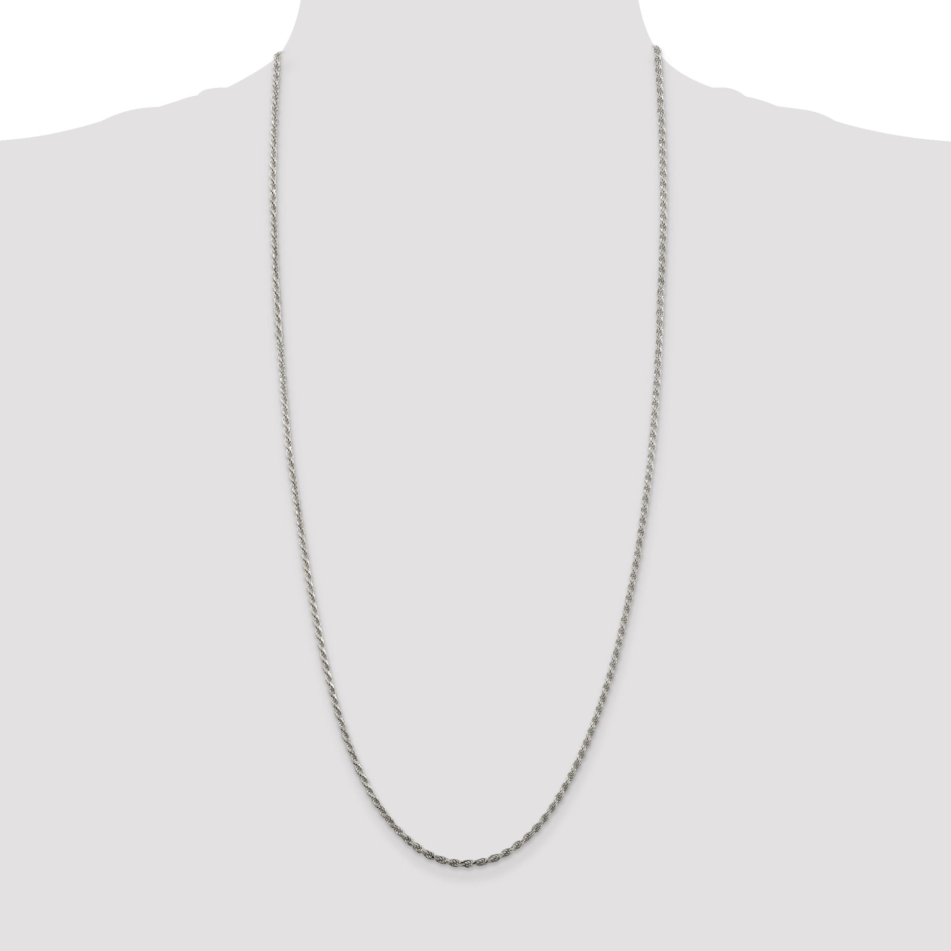 The 30 Inch Sterling Silver 2.25mm Diamond-Cut Rope Chain makes a stunning addition to any jewelry collection. Crafted from 925 sterling silver, this chain boasts a polished finish. Its intricate diamond-cut texture and substantial 2.25mm width create an eye-catching sparkle. With a sturdy lobster clasp, this piece lives up to daily wear. The chain's 30-inch length allows versatile styling—perfect alone or layered. Coated to resist tarnish, it promises lasting beauty and shine. Make a statement with the 30 Inch Sterling Silver 2.25mm Diamond-Cut Rope Chain, an essential for any woman’s wardrobe.