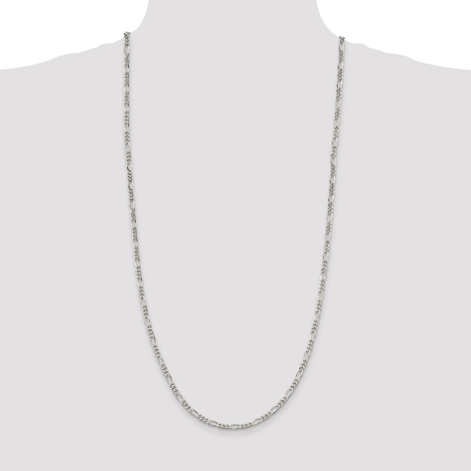 Introducing the 30 Inch Sterling Silver 3.5mm Figaro Chain, a stylish addition to any jewelry collection. Crafted from high-quality 925 sterling silver, this necklace glistens with a polished finish, radiating elegance and sophistication. The Figaro chain design, with its distinct pattern, adds a touch of flair to any outfit. With a solid construction and a secure lobster clasp, this piece offers durability and ease of wear. Perfectly machine-made, this 3.5mm wide chain makes a bold statement, beautifully draping at 30 inches around the neck. Elevate your look with the genuine allure of the 30 Inch Sterling Silver 3.5mm Figaro Chain.