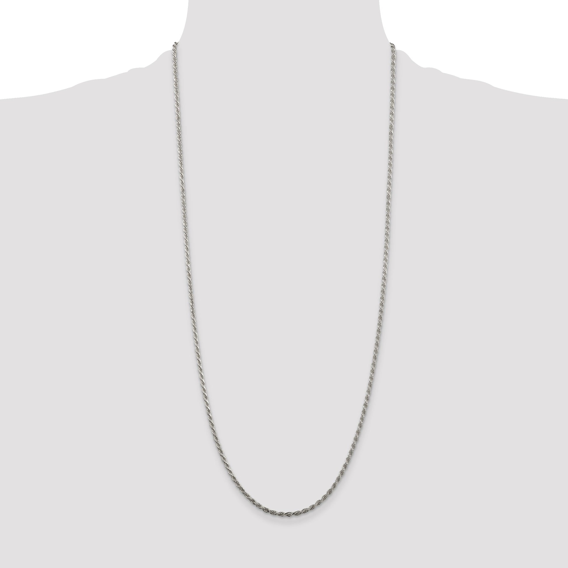 The 30 Inch Sterling Silver Rhodium-Plated 2.25mm Diamond-Cut Rope Chain is a classic accessory crafted for elegance. This necklace, offering a striking 30-inch length, dazzles with its diamond-cut texture and solid rope design. Made from high-purity 925 sterling silver with a sleek rhodium plating, it radiates a brilliant silver tone. The chain's polished finish and distinct 2.25mm width accentuate its luxurious look, ideal for everyday chic or special occasions. A sturdy lobster clasp ensures secure wear. Elevate your jewelry ensemble with this exquisite 30 Inch Sterling Silver Rhodium-Plated Rope Chain, perfect for women who embrace style.