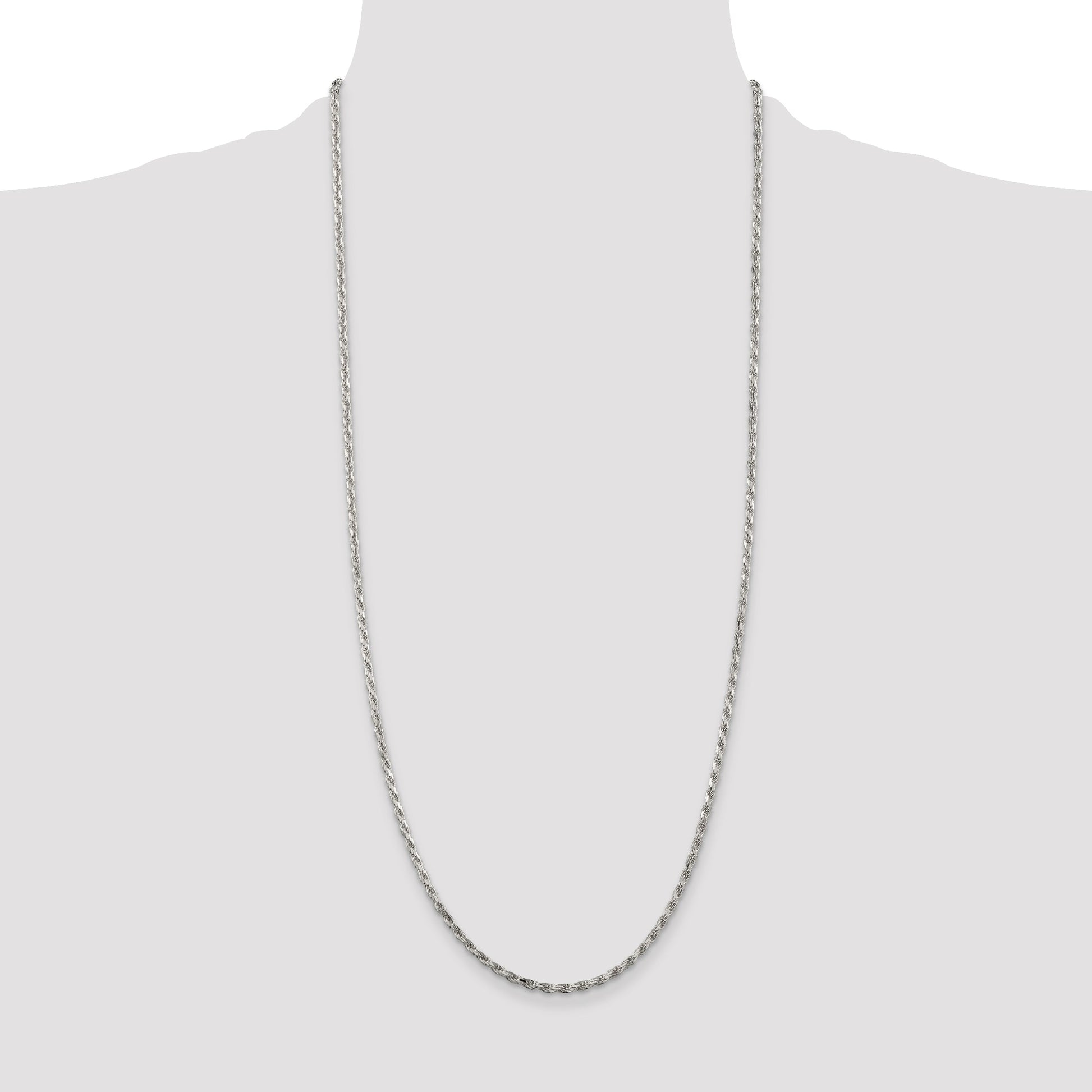 Experience elegance with our 30-Inch Sterling Silver Rhodium-Plated Rope Chain. Crafted from premium 925 sterling silver, this necklace glistens with a polished finish. Its 2.5mm width and diamond-cut texture give it a unique sparkle that catches the light beautifully. The rhodium plating offers a stunning silver tone and durability, ensuring lasting shine. Its 30-inch length provides a versatile style, perfect for layering or wearing alone. With a reliable lobster clasp, the chain stays secure around your neck. Elevate your jewelry collection with this exquisite Sterling Silver Rhodium-Plated Rope Chain, a true standout piece for any occasion.