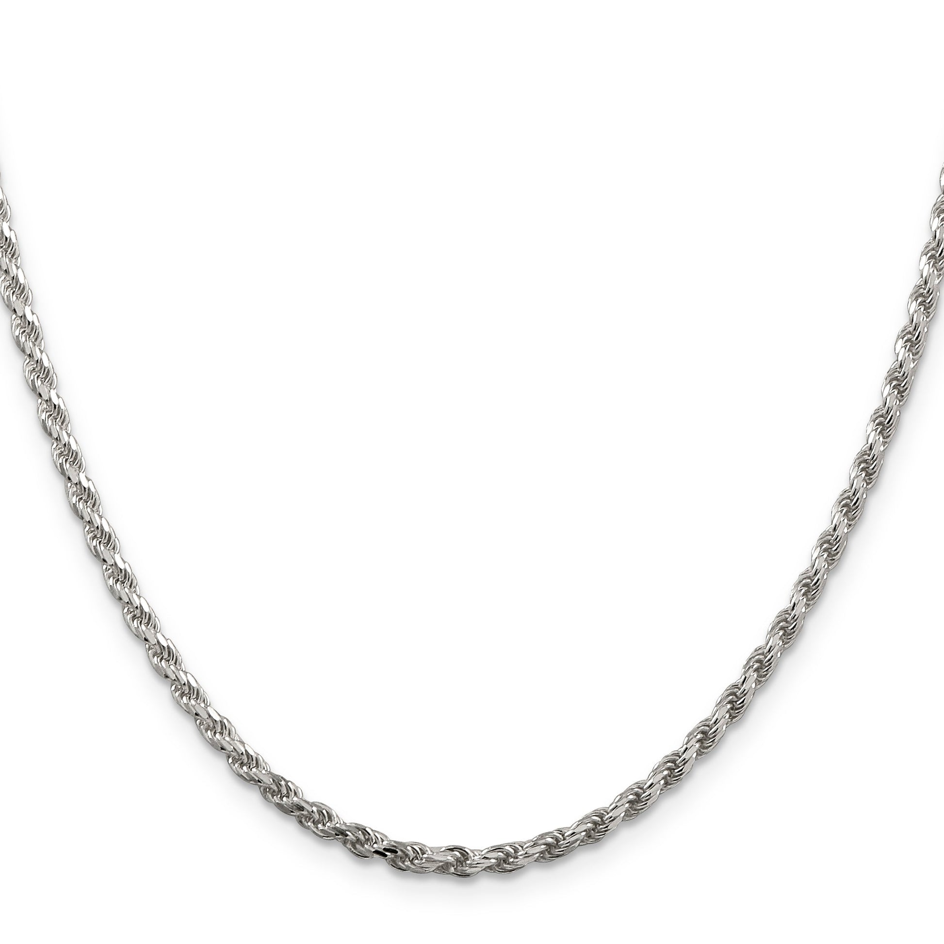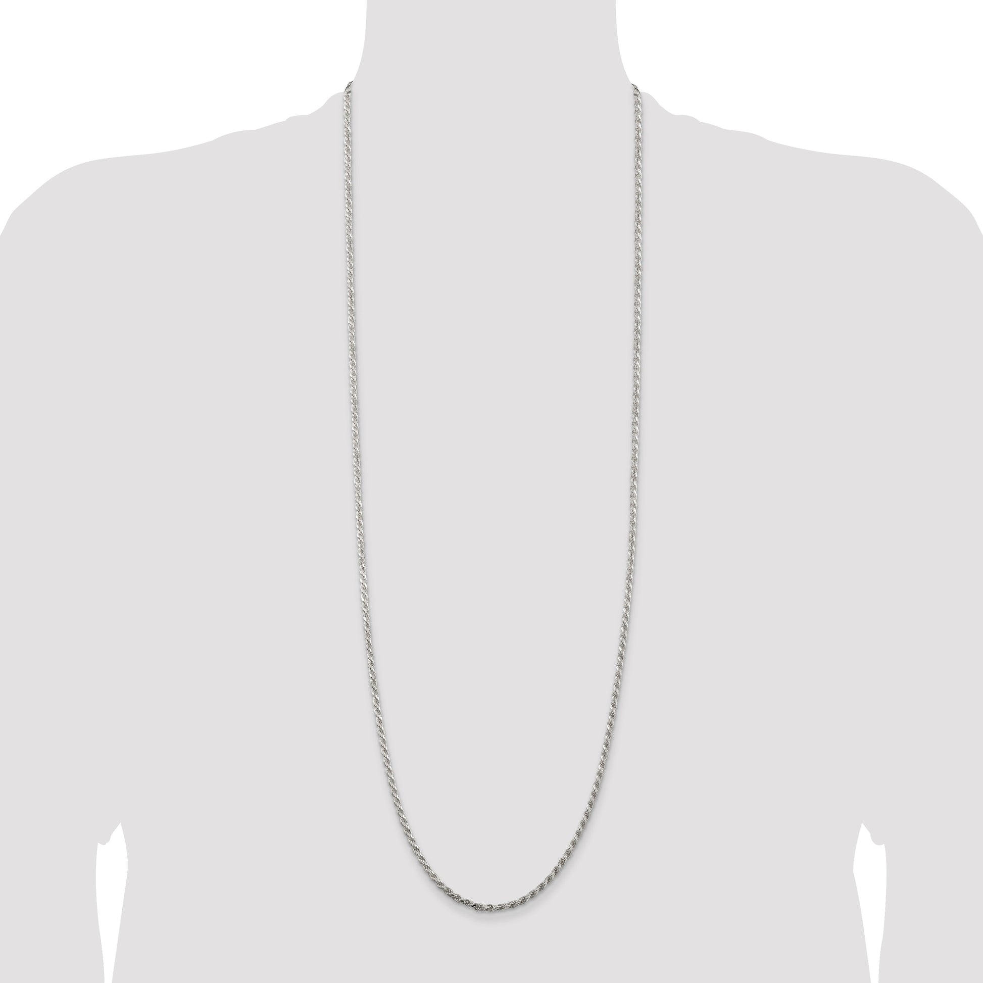 Elevate your style with the 36-Inch Sterling Silver Rhodium-Plated Diamond-Cut Rope Chain. Crafted from 925 sterling silver, this chain showcases a polished finish that shines brilliantly. Its rhodium plating adds a sleek, silver tone that enhances its elegance, while the diamond-cut texture offers a distinctive sparkle. Measuring 2.75mm in width, this chain combines durability with a refined look. The lobster clasp ensures a secure fit, making it ideal for daily wear or special occasions. This stunning piece is a testament to timeless design, adding a touch of sophistication to any woman's jewelry collection.