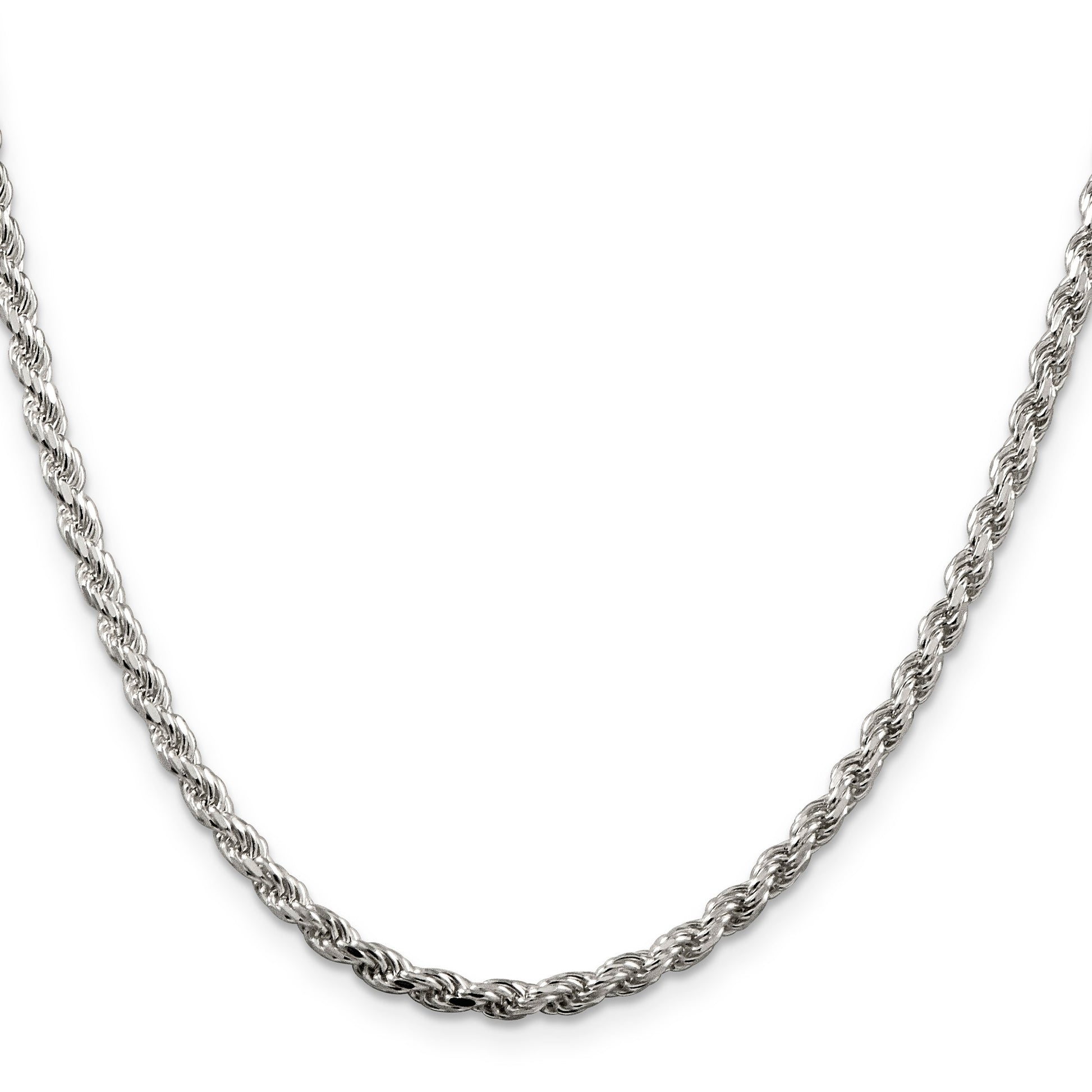 Elevate your style game with this stunning 36 Inch Sterling Silver Rhodium-Plated 3.2mm Diamond-Cut Rope Chain. Crafted from high-quality 925 sterling silver, this necklace boasts a polished finish that gleams with every turn. The rhodium plating adds a sophisticated touch, enhancing both durability and luster. Featuring a solid, casted rope design with diamond-cut texture, this piece captures light beautifully. The lobster clasp offers security and easy wear, making it perfect for daily use or special occasions. Discover timeless elegance with this 36 Inch Sterling Silver Rhodium-Plated 3.2mm Diamond-Cut Rope Chain, ideal for any fashion-forward wardrobe.