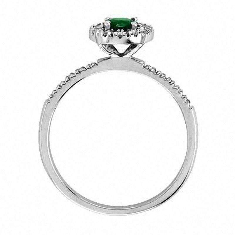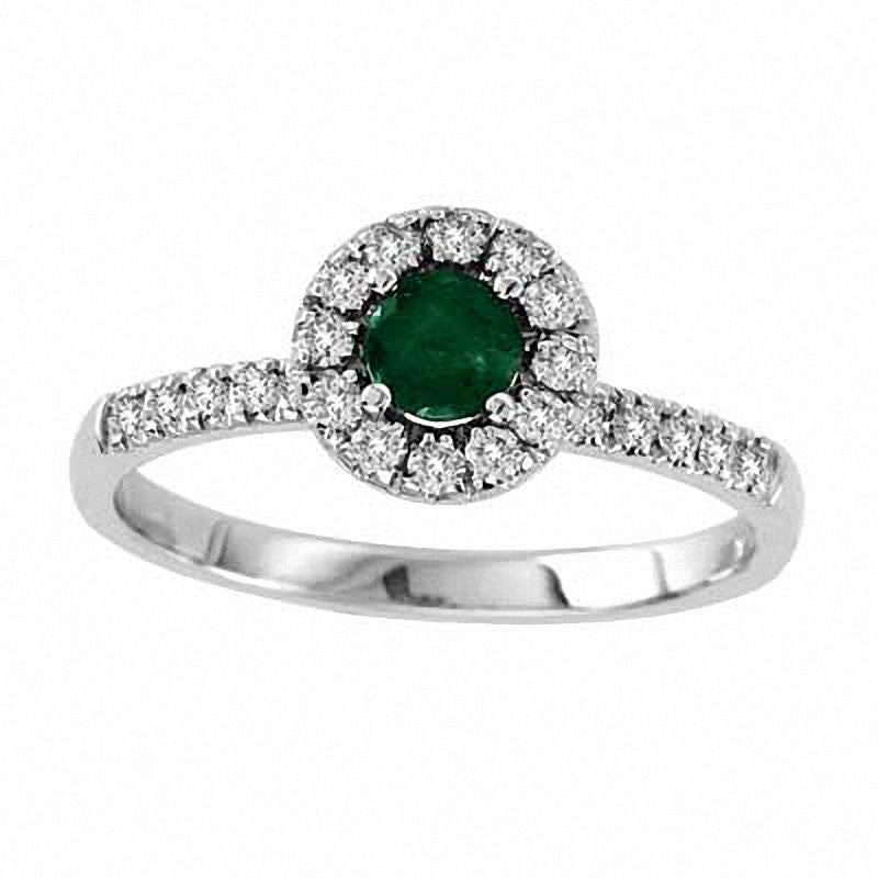 Unleash your unique sense of style with this breathtaking gemstone engagement ring. Meticulously designed in luminous 14K white gold, this ring boasts a spectacular 4.0mm emerald that radiates with a vivid green hue. A halo of exquisite round diamonds encircles the emerald, creating a glistening border that beautifully accentuates its brilliance. The shank of the ring is also adorned with a row of sparkling diamonds, adding an extra touch of luxury to this statement piece. With a total weight of 1/4 ct. t.w., the diamonds provide an extraordinary sparkle that shimmers from every angle. The polished finish enhances the elegance of this remarkable ring, making it an irresistible choice for an unforgettable proposal.