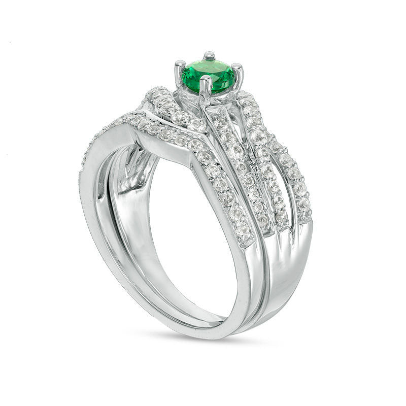 4.5mm Lab-Created Emerald and White Sapphire Bypass Bridal Engagement Ring Set in Solid 10K White Gold