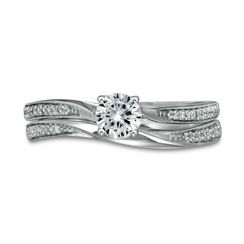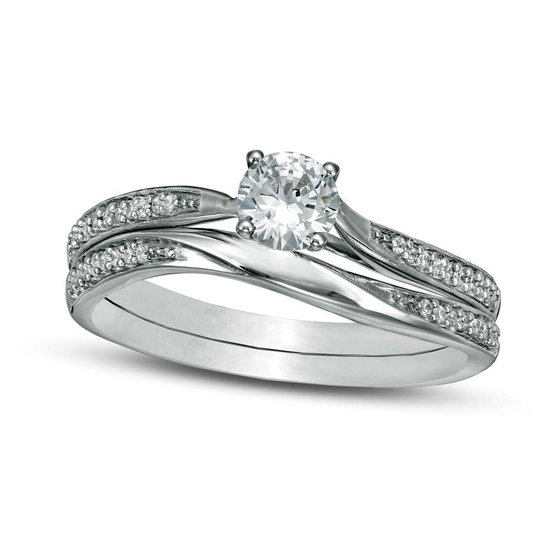 4.5mm Lab-Created White Sapphire and 0.13 CT. T.W. Diamond Waves Bridal Engagement Ring Set in Solid 10K White Gold