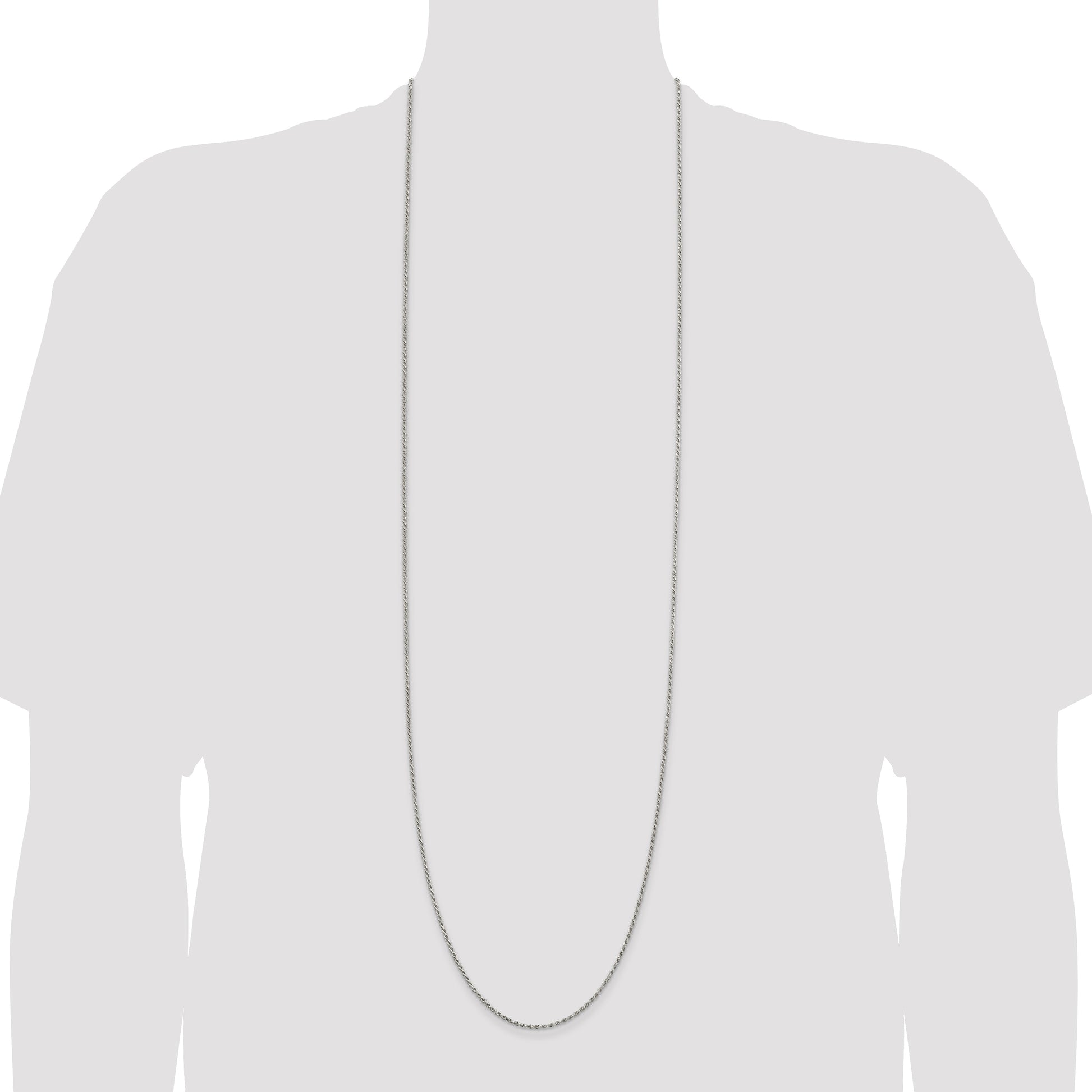 The 42 Inch Sterling Silver 1.7mm Diamond-Cut Rope Chain blends style with elegance. This piece, crafted from 925 sterling silver, shines with a polished finish. Its 1.7mm diamond-cut design catches light beautifully, adding a unique sparkle to any outfit. The chain's solid build and 42-inch length provide versatility, perfect for layering or wearing alone. A lobster clasp ensures secure wear, for daily reliability. Made with precision, this machine-made piece makes a subtle yet striking statement. Discover enduring beauty with the 42 Inch Sterling Silver 1.7mm Diamond-Cut Rope Chain, an essential for any jewelry collection.