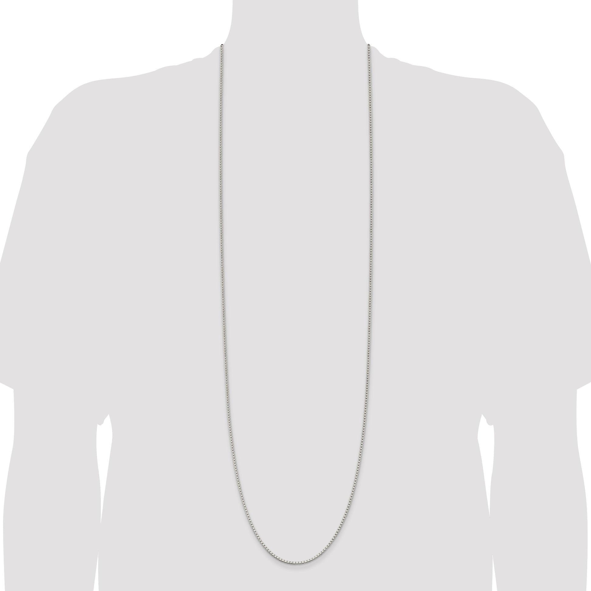 The 42 Inch Sterling Silver 2mm Box Chain dazzles with its sleek, polished finish and timeless appeal. Crafted from high-quality 925 sterling silver, it gleams with a luminous white hue that elevates any outfit. The box chain design, measuring 2mm in width, offers both durability and style, while its generous 42-inch length allows for versatile wearing options. With a sturdy lobster clasp, this chain promises security during wear. An anti-tarnish coating ensures lasting brilliance. This women's chain offers machine-made precision and serves as a perfect jewelry accent for any wardrobe. The 42 Inch Sterling Silver 2mm Box Chain is the epitome of classic elegance.