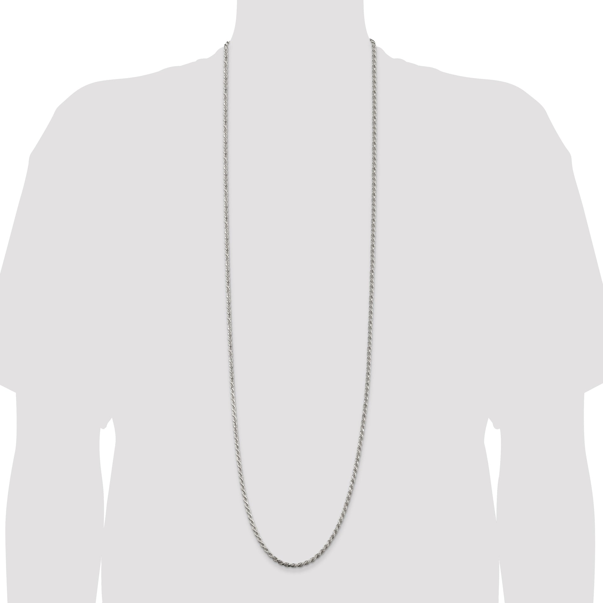 The 42 Inch Sterling Silver 3.2mm Diamond-Cut Rope Chain is a stunning piece for any jewelry collection. Crafted from high-purity 925 sterling silver, this chain showcases a polished finish that gleams elegantly. The diamond-cut texture enhances the rope chain's texture, providing a shimmering effect that catches the eye. Measuring 42 inches in length and 3.2mm in width, it offers versatility, ideal for layering or as a standalone statement. The lobster clasp ensures security, while the anti-tarnish coating keeps it looking flawless. Elevate your style with this intricately designed Sterling Silver Rope Chain.