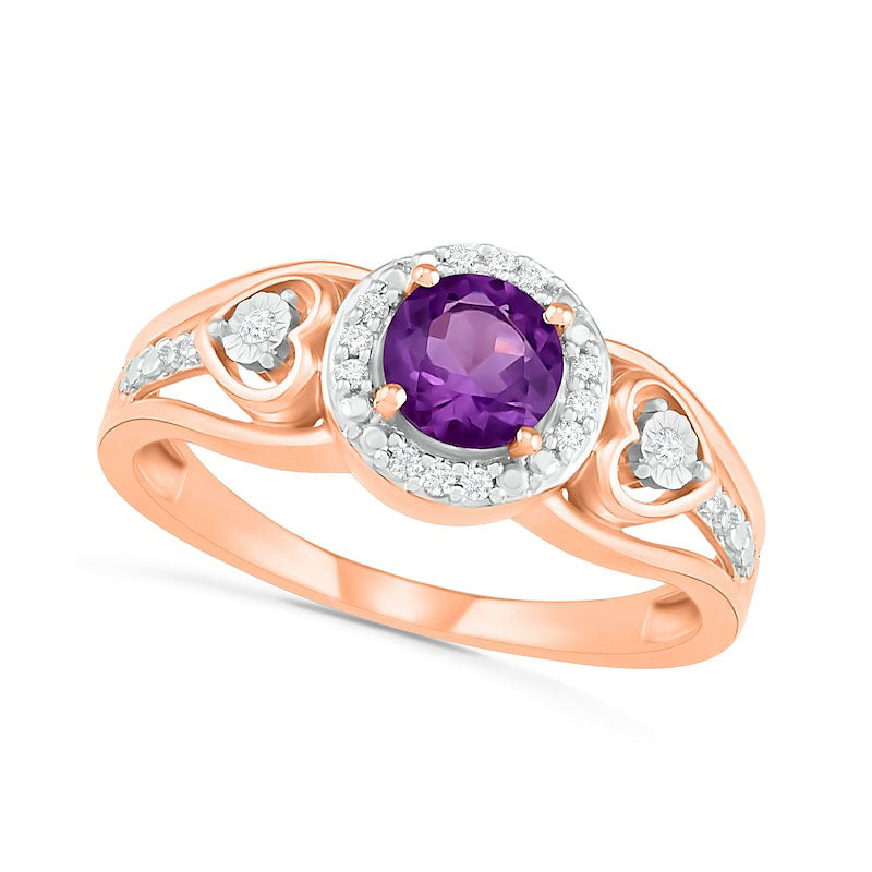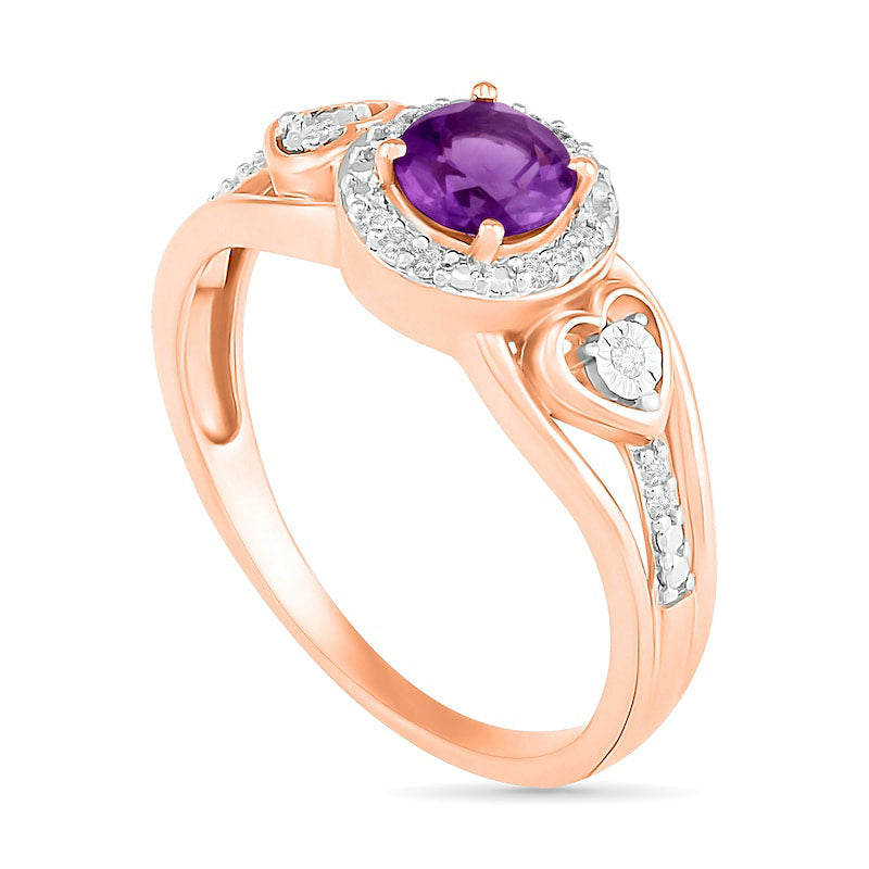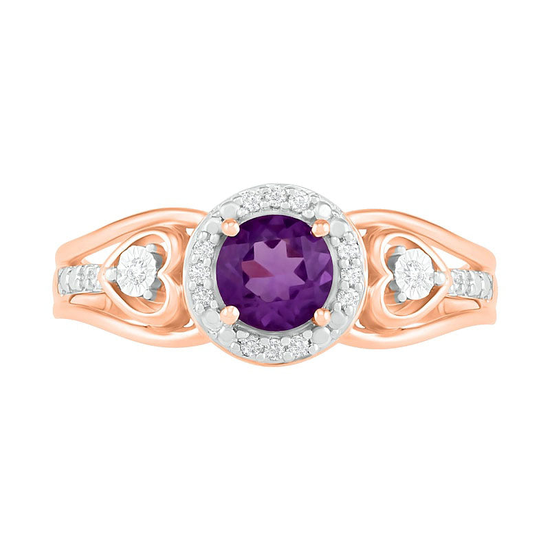 This spectacular ring exudes a playful energy, featuring a stunning 5.0mm amethyst gemstone surrounded by a delicate frame adorned with twinkling diamonds. Crafted in stunning 10K rose gold, the center ribbon of the shank is embellished with a sleek row of diamonds, while two dazzling diamonds are nestled in heart-shaped frames to add a touch of romance to the design. The split shank is polished to perfection, combining elegance and modern style. Boasting a total diamond weight of 1/15 ct. t.w. and a brilliant buffed luster, this ring is an extraordinary piece that is sure to turn heads.