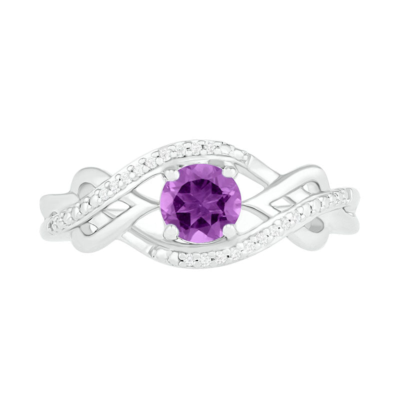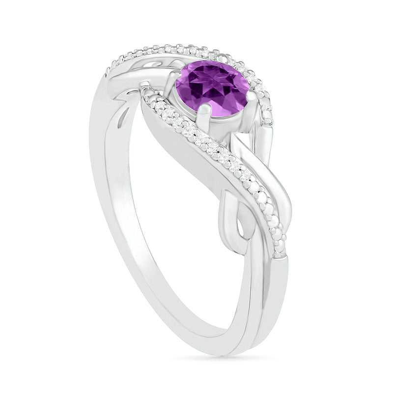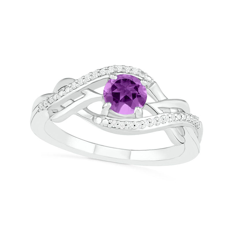 Experience a fresh take on a timeless design with this exquisite gemstone and diamond ring. Elegantly crafted in sterling silver, this ring boasts an infinity symbol-inspired design, which features a stunning 5.0mm amethyst, adding that beautiful pop of purple to your outfit. The gracefully arranged ribbons lined with sparkling diamonds cross over and under polished heart-shaped details, creating a beautiful braided and layered style. The diamonds weigh in at 1/20 ct. t.w. and are incredibly radiant, giving off a breathtaking shine. With its impeccable beauty and splendid luster, this ring is the perfect everyday accessory.