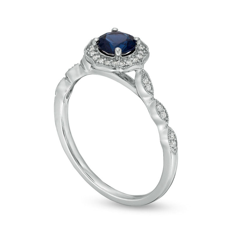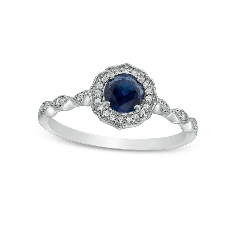 5.0mm Blue Lab-Created Sapphire and 0.10 CT. T.W. Diamond Quatrefoil Frame Art Deco Engagement Ring in Sterling Silver
