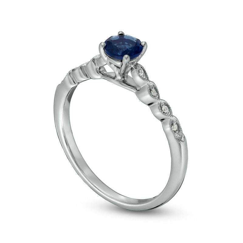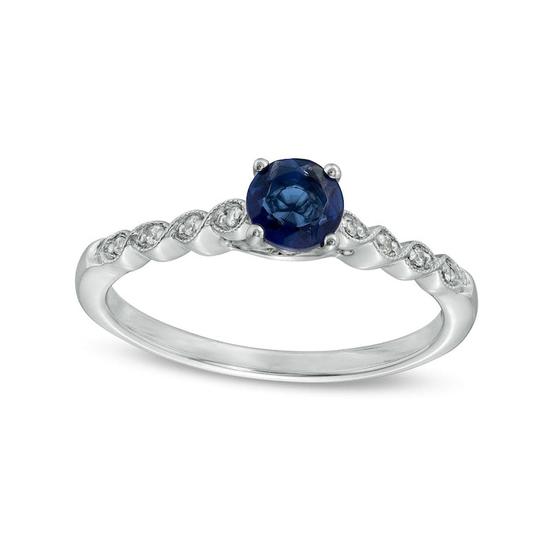 Celebrate your love with this exquisite engagement ring that will captivate your beloved. Crafted in stunning sterling silver, it showcases a dazzling 5.0mm lab-created sapphire in vivid blue hue. The shank of the ring features intricate twist ribbons, accented with shimmering diamond accents arranged in a cascading pattern, adding to the ring's unique charm. This engagement ring is polished to a brilliant, shining finish, making it a truly remarkable symbol of your affection.