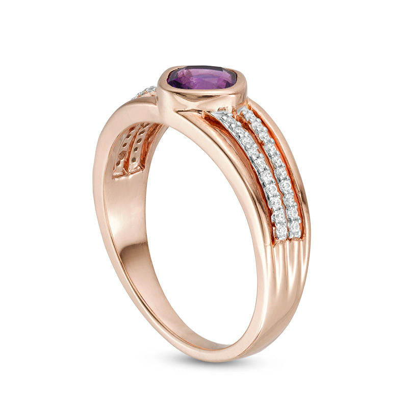 Bring vibrance and romance to your outfit with this stunning gemstone and diamond ring. Crafted from precious 10K rose gold, this timeless piece showcases a 5.0mm cushion-cut bright purple amethyst, securely set in a bezel. The split shank boasts an intricate design that dazzles with two rows of petite diamonds and polished outer ribbons, adding to the overall shimmer of the ring. With a total weight of 1/8 ct. t.w. of diamonds and a brilliant buffed finish, this ring exudes elegance and sophistication, making it the perfect addition to your fine jewelry collection.