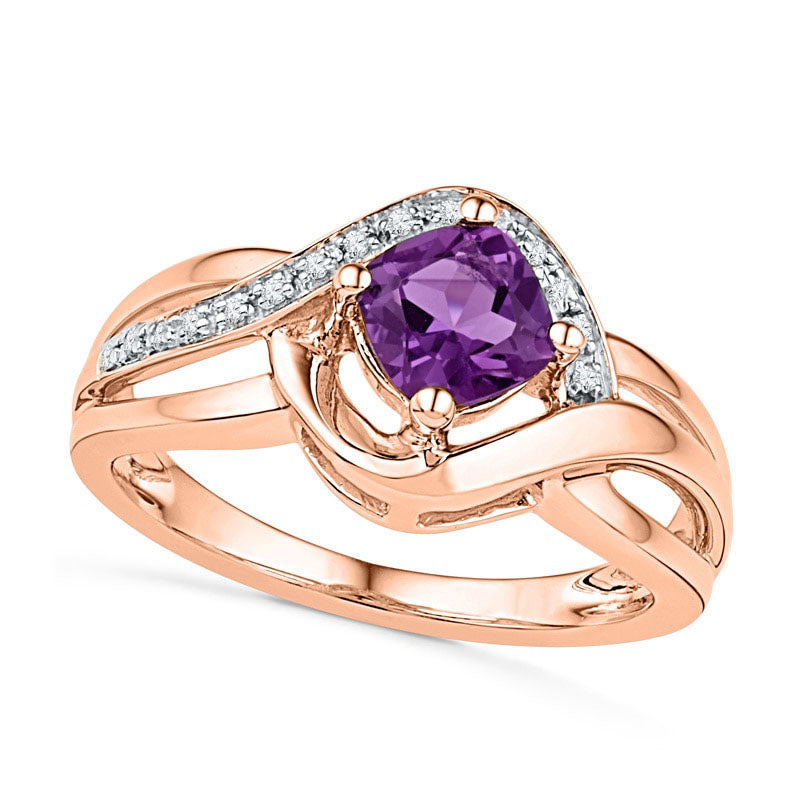 5.0mm Cushion-Cut Amethyst and Natural Diamond Accent Ring in Solid 10K Rose Gold