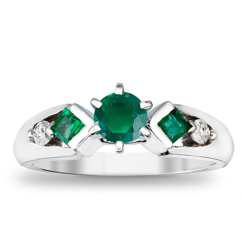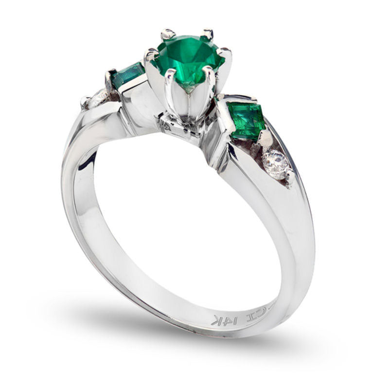 This engagement ring is truly distinctive and refined. Crafted in 14K white gold, it showcases a striking 5.0mm emerald in a raised six-prong cathedral setting, complemented by smaller princess-cut emeralds on either side for a geometric touch. The design is elevated by stunning accent diamonds that add just the right amount of sparkle. With 1/10 ct. t.w. of diamonds and a high-polish finish, this ring is perfect for the contemporary bride seeking sophistication and style.