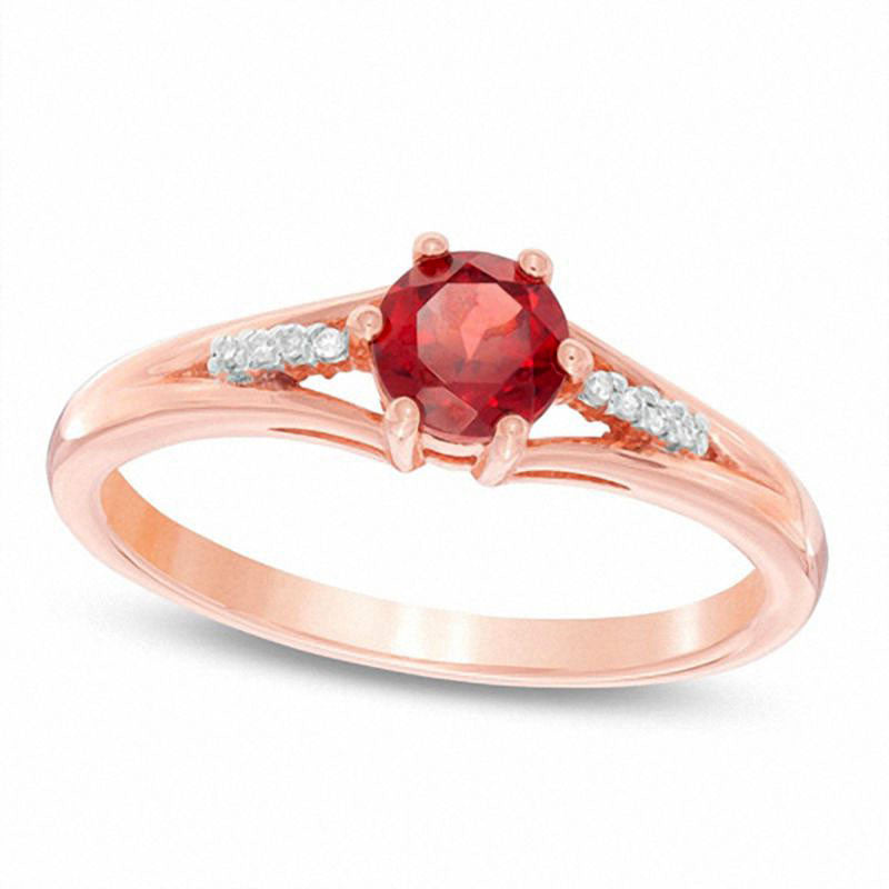 Enhance any look with a touch of vibrant color by adorning your finger with this exquisite 5.0mm Garnet and Diamond Accent Split Shank Ring in 10K Rose Gold. With its delicate yet eye-catching design, this ring is the perfect accessory for any occasion. Created with the finest 10K rose gold, the split-shank style showcases a stunning 5.0mm garnet gemstone that exudes regal beauty. Glistening on either side of the center stone, a row of petite diamond accents provides an exquisite touch of sparkle. With its understated elegance, this ring is a timeless piece that will never go out of style. Crafted to perfection, this ring is polished to a brilliant luster that is bound to catch the eye.