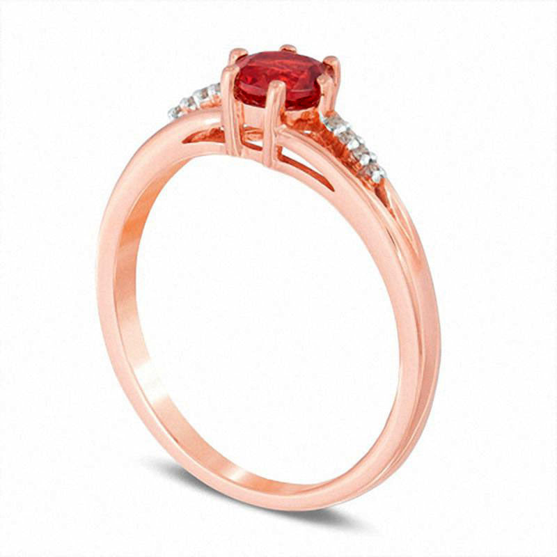 Enhance any look with a touch of vibrant color by adorning your finger with this exquisite 5.0mm Garnet and Diamond Accent Split Shank Ring in 10K Rose Gold. With its...
