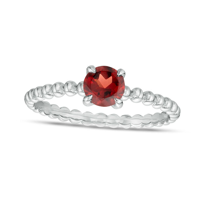 Elevate your style with this vibrant garnet beaded stackable ring. Crafted from 10K white gold, the ring features a striking 5.0mm red garnet at the center, set on a sculpted...