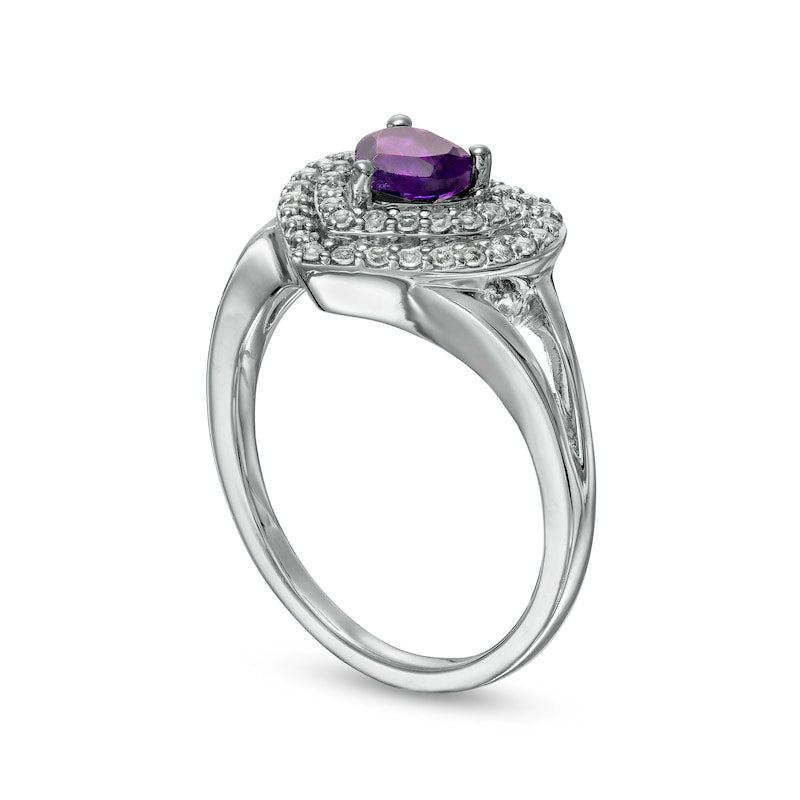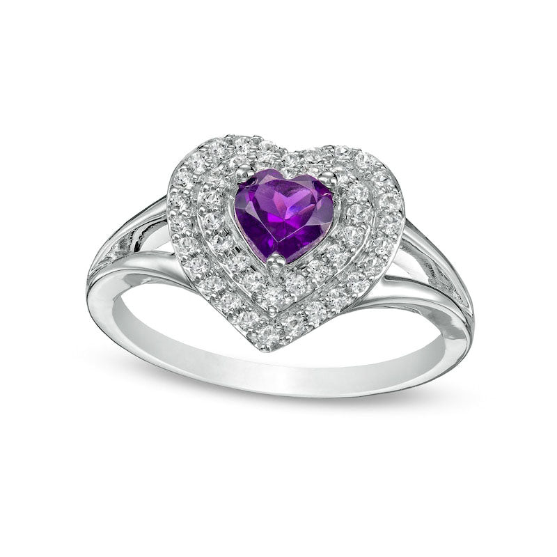 Crafted with precision in sterling silver, this stunning double frame ring highlights a 5.0mm heart-shaped amethyst at its center, surrounded by glittering white lab-created sapphires. The perfect accessory to elevate your ensemble with its captivating and sophisticated design.