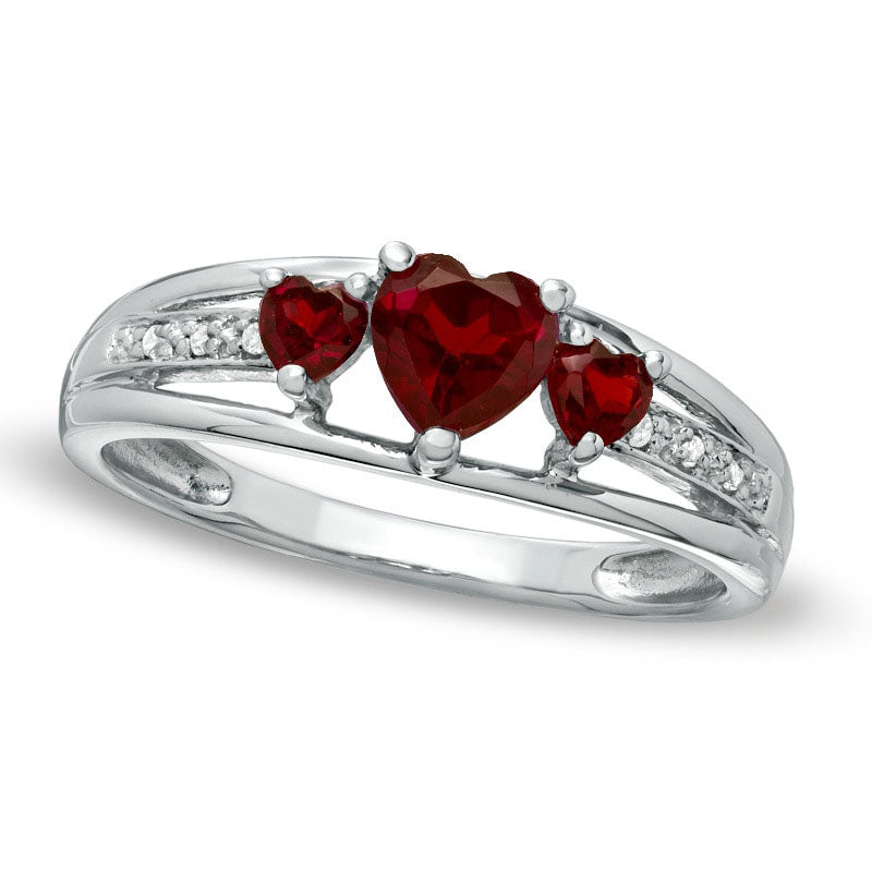 5.0mm Heart-Shaped Garnet and Natural Diamond Accent Three Stone Promise Ring in Solid 10K White Gold