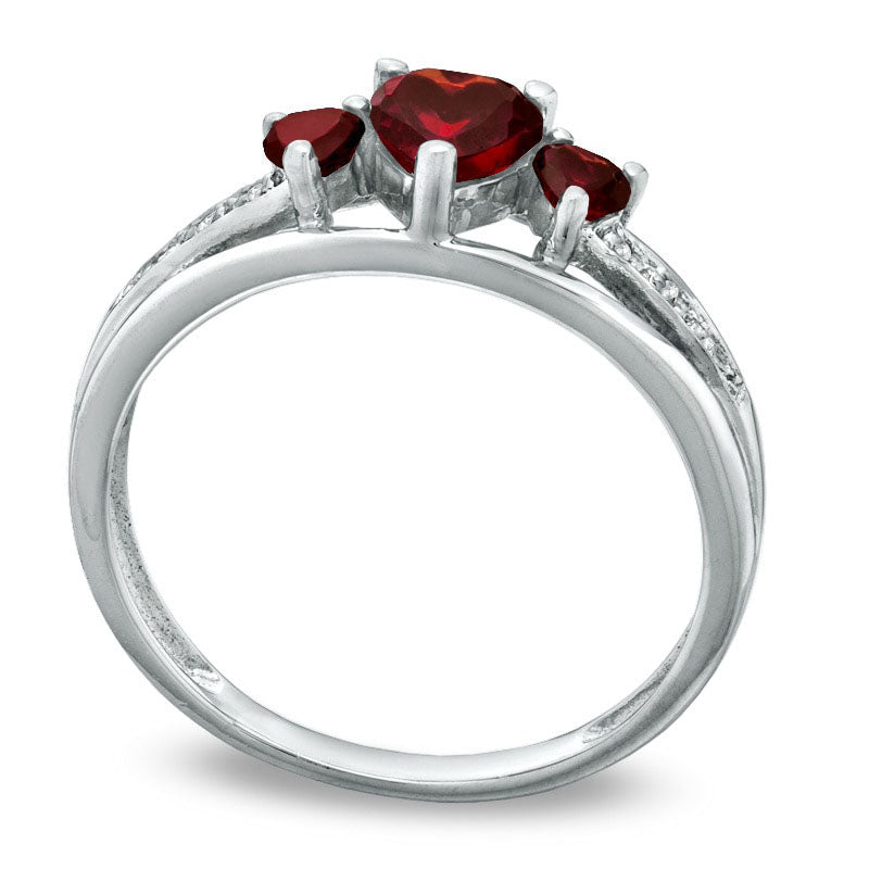 Celebrate your love with this stunning 10K white gold promise ring featuring three gorgeous heart-shaped garnet gemstones in the center, perfect for your special someone with a January birthday. The...
