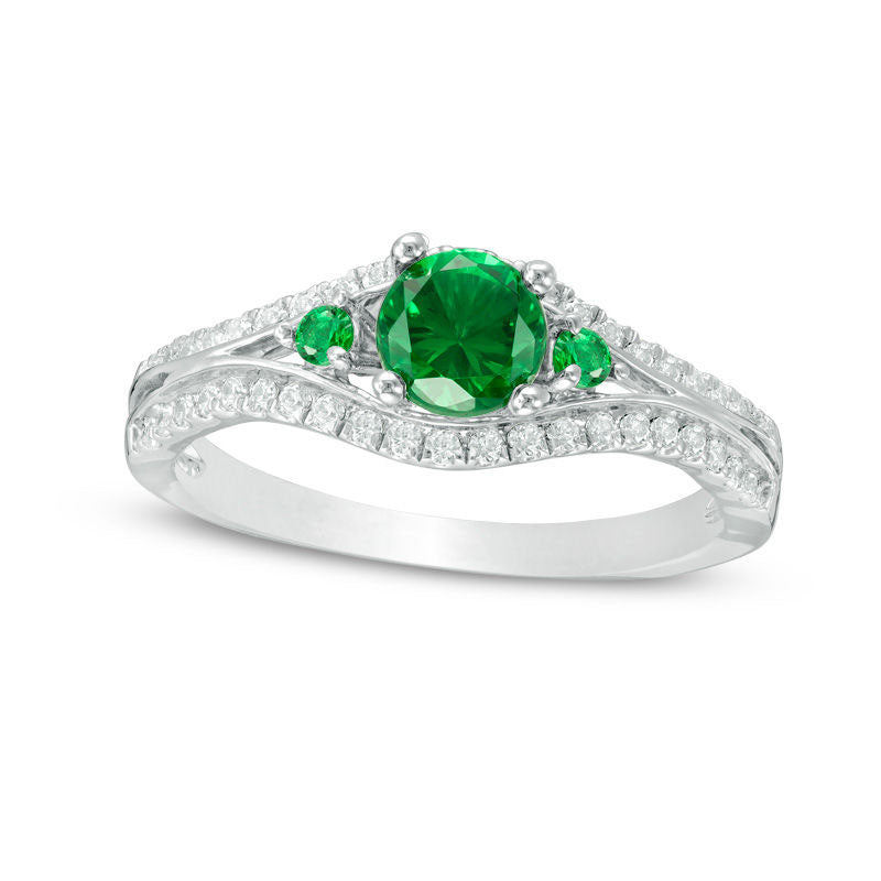 This stunning engagement ring is a classic design with a unique pop of color. Made from high-quality sterling silver, this ring features a 5.0mm lab-created emerald in a beautiful verdant-green hue, flanked by 2.0mm created emeralds. The split shank is elegantly curved and adorned with dazzling diamonds, totaling 1/4 ct. t.w. The brilliant luster of the diamonds adds a touch of glamour to this timeless piece. A perfect choice for your one-of-a-kind bride, this engagement ring will surely be cherished for a lifetime. Please note that this ring is custom-made to fit your desired ring size and cannot be resized after purchase.