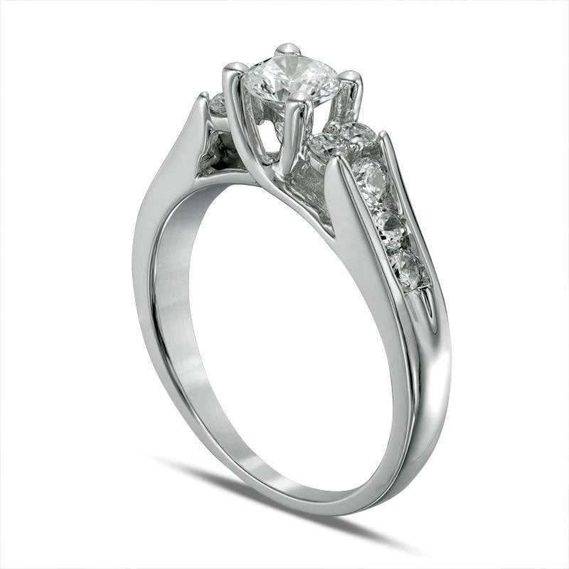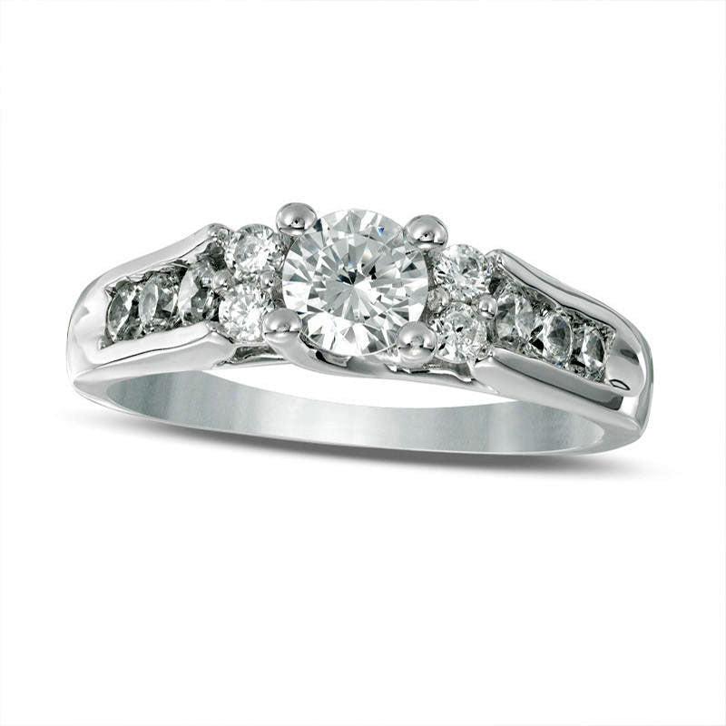 This stunning engagement ring will make your beloved's heart skip a beat. It features a dazzling 5.1mm lab-created white sapphire at its center, surrounded by pairs of smaller created sapphires....