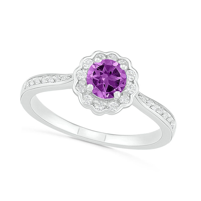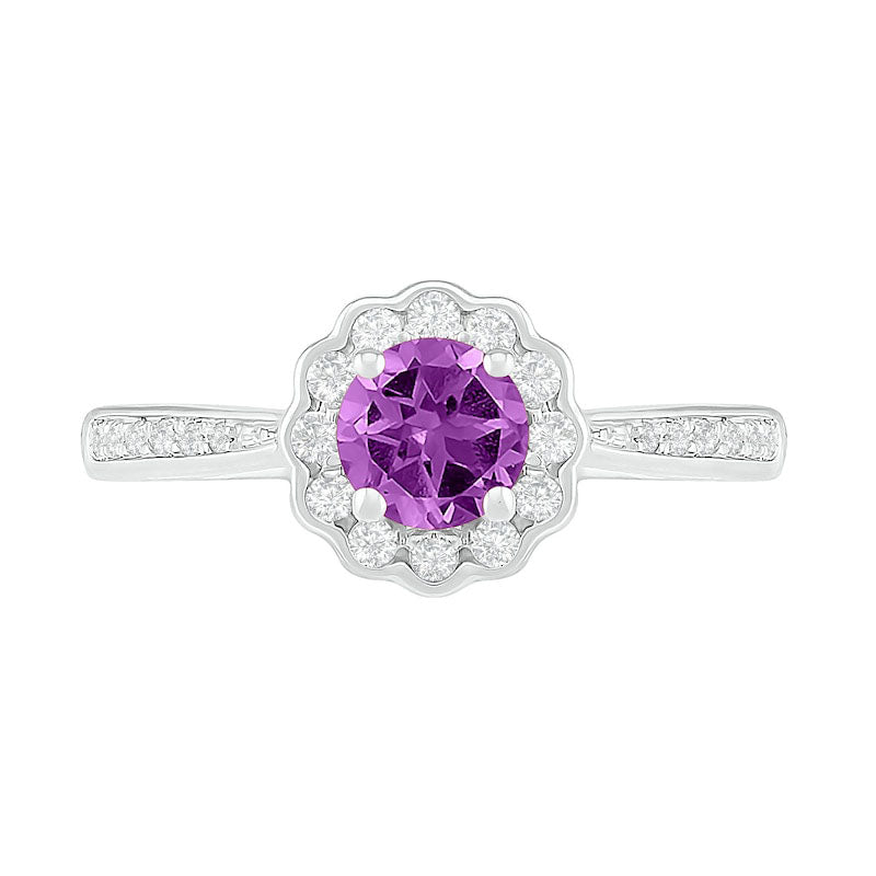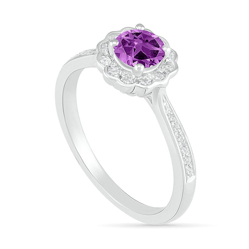 Add a vibrant touch of color to your loved one's wardrobe with this charming gemstone ring. Created with high-quality sterling silver, this ring features a beautiful floral design that highlights a stunning 5.2mm radiant purple amethyst. The amethyst is elegantly framed by a scalloped border made up of dazzling lab-created white sapphires, bringing an extra touch of glamour to the piece. The ring's tapered shank is also adorned with petite lab-created white sapphires, adding even more sparkle to the already captivating design. Polished to a stunning shine, this ring is a perfect feminine accessory that your loved one is sure to cherish.