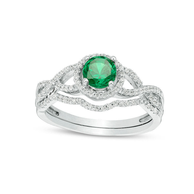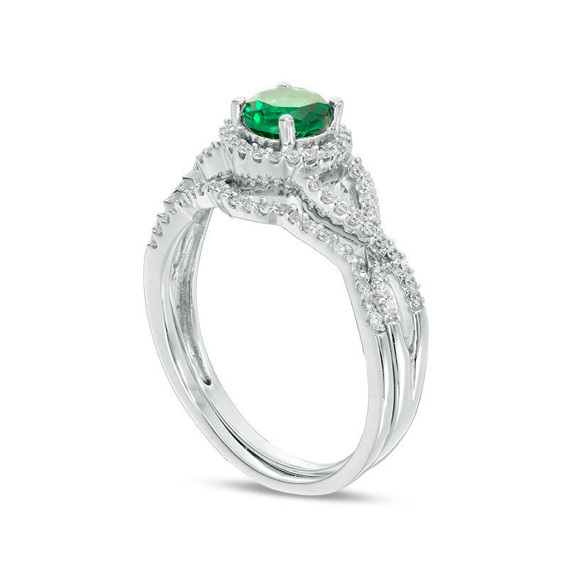 5.2mm Lab-Created Emerald and 0.25 CT. T.W. Diamond Twist Shank Bridal Engagement Ring Set in Solid 10K White Gold