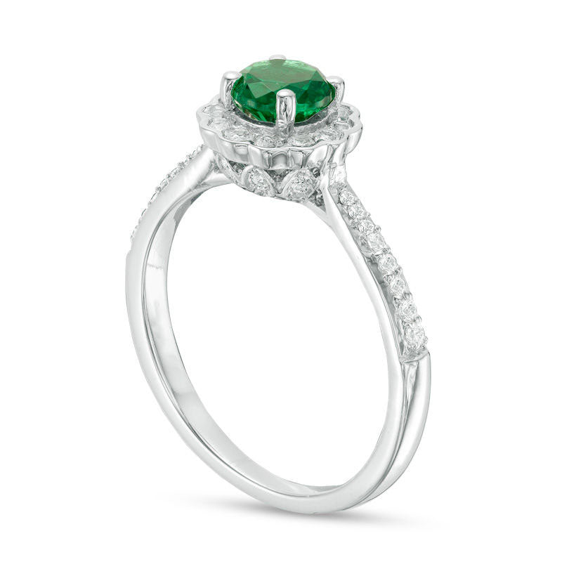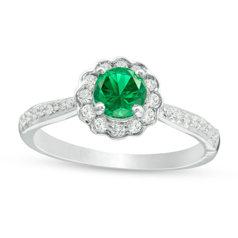 5.2mm Lab-Created Emerald, White Sapphire and 0.10 CT. T.W. Diamond Flower Frame Engagement Ring in Sterling Silver