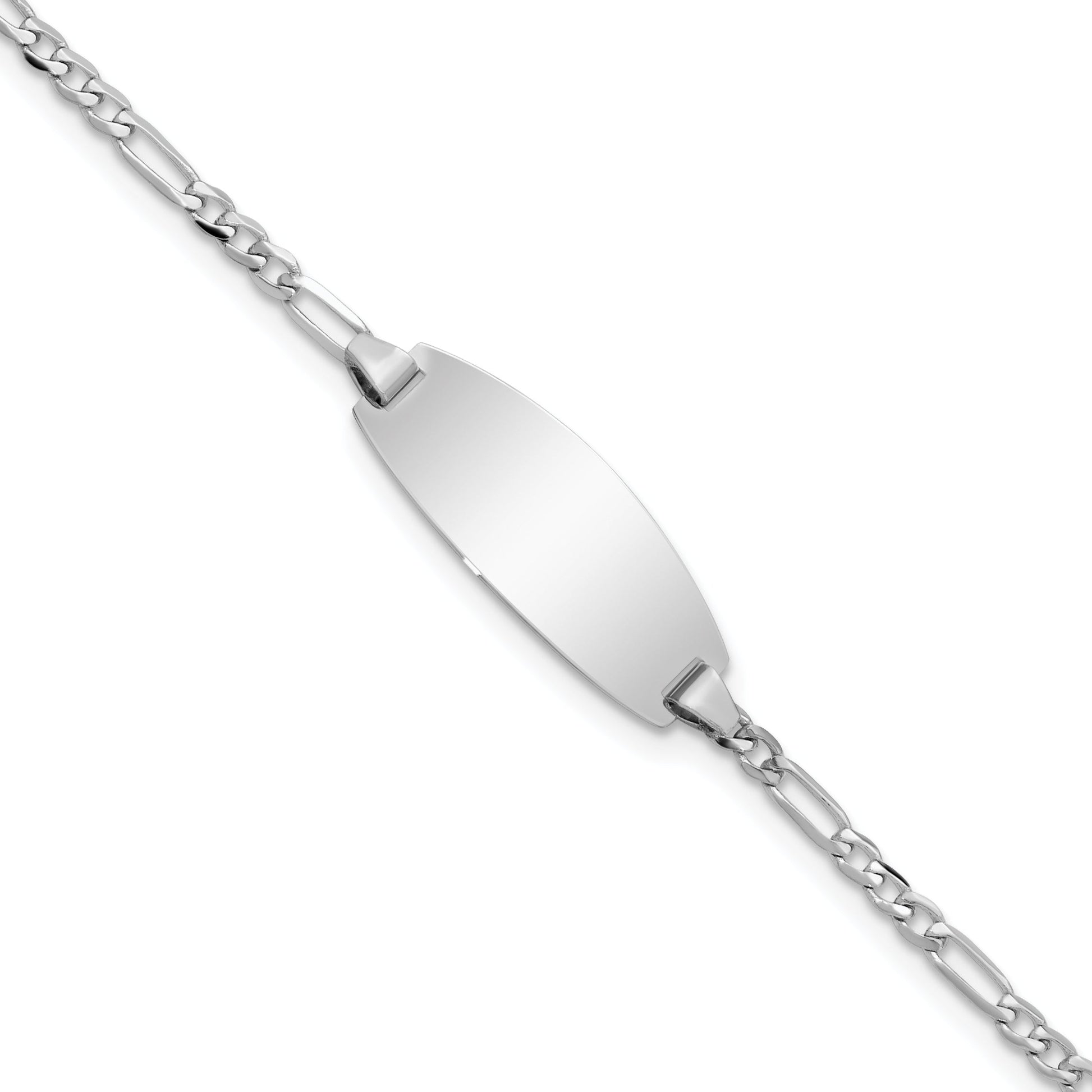 Step up your jewelry game with the stunning 5.5 Inch 14K White Gold Oval Figaro ID Bracelet. Crafted from polished 14K white gold, this bracelet shines brightly on any wrist. The intricate Figaro chain design adds a unique touch to this unisex piece, enhancing its timeless appeal. Featuring a lobster clasp for secure wear, it fits perfectly at 5.5 inches. The engageable ID plate offers personalization, making it an ideal gift for loved ones. The rhodium plating ensures long-lasting durability. This 5.5 Inch 14K White Gold Oval Figaro ID Bracelet is a versatile accessory for any style.
