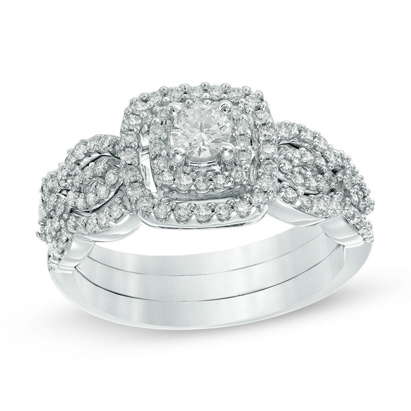 Manufactured in 14K white gold, this bridal engagement ring features a 1/5 ct. round diamond center stone surrounded by a double cushion-shaped frame of smaller accent diamonds. The ring's twisting shank sparkles with additional accent diamonds.