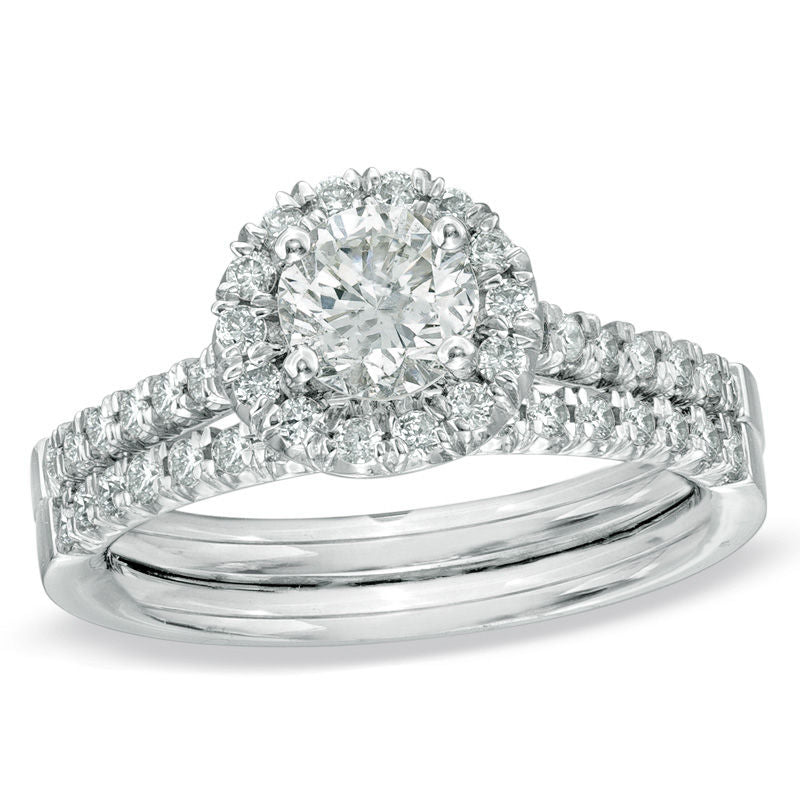 Manufactured in 14K white gold, this bridal engagement ring showcases a 1/4 ct. round diamond center stone. A halo frame of smaller accent diamonds surrounds the center stone , while additional diamonds line the slender shank.