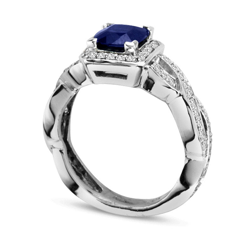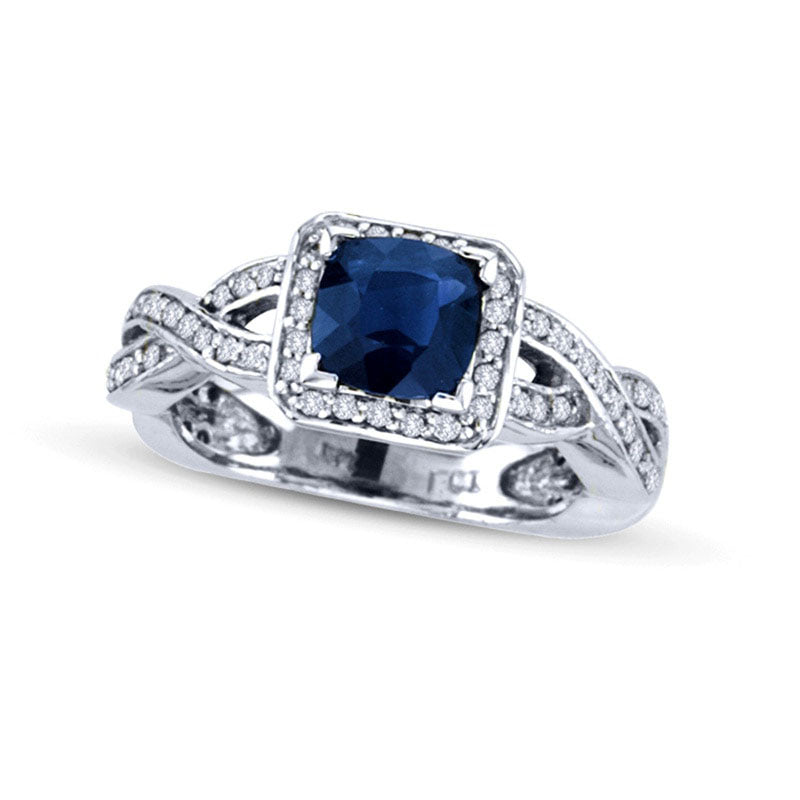 Present your loved one with a stunning display of romance and elegance with this remarkable 14K white gold engagement ring. The centerpiece of this ring is a brilliant 6.0mm cushion-cut blue sapphire that will capture her heart. Encircling this gorgeous gemstone is a shimmering frame of round diamonds that radiate beauty and prestige. The ring's double shank is intricately designed with diamond-lined ribbons that add a unique touch of sophistication. With a total weight of 3/8 ct. t.w., this ring is sure to be a timeless symbol of love and commitment. It shines brightly with a smooth polished finish that will glow magnificently on her finger. Give her the ultimate expression of your love with this unforgettable engagement ring.