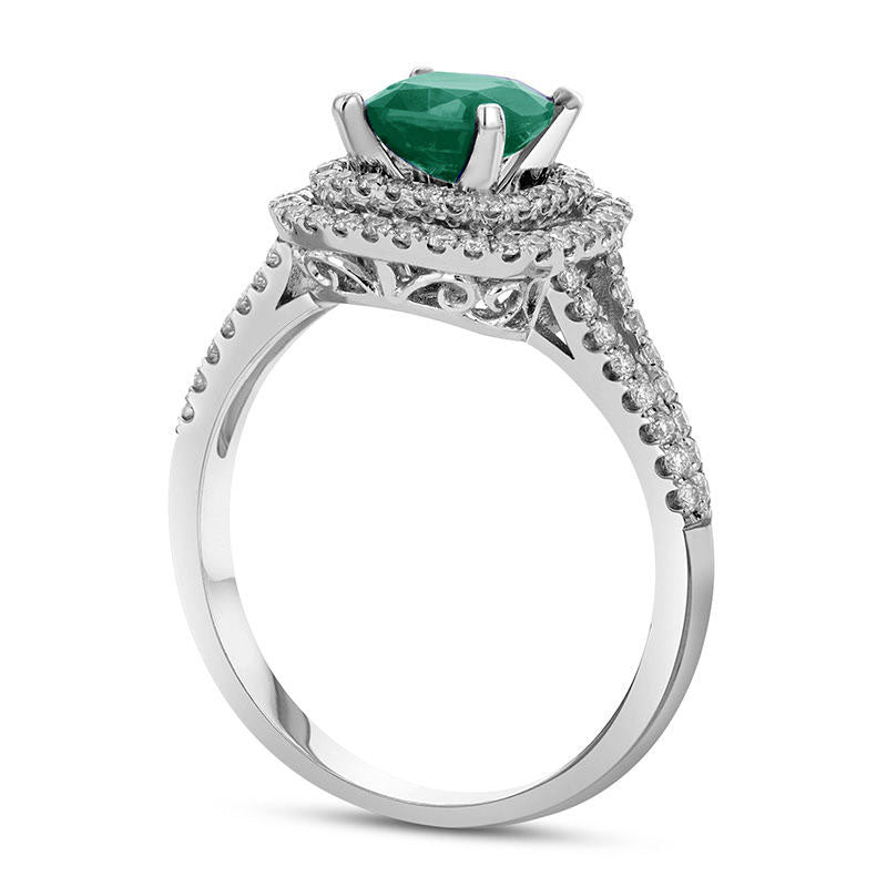 Make a bold statement of your love with this stunning emerald and diamond engagement ring. Crafted in 14K white gold, this exquisite piece features a captivating 6.0mm cushion-cut emerald in a double frame of brilliant diamonds. The split shank band also dazzles with additional diamonds, making this ring truly sparkle. With a total diamond weight of 3/8 ct. and a brilliant shine, this exceptional ring is the epitome of elegance and romance. Declare your love with this gorgeous engagement ring that will truly show how much she means to you.