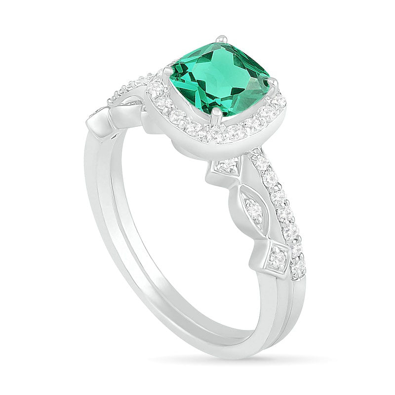 Fall in love with this sophisticated and elegant bridal set featuring a breathtaking gemstone and diamond combination. The 10K white gold engagement ring boasts a brilliant 6.0mm cushion-cut lab-created emerald nestled within a shimmering frame of diamonds, atop a slender band also adorned with petite diamonds. The coordinating wedding band is designed with art deco-inspired touches, featuring a row of marquise and tilted-square shapes encrusted with dazzling diamonds. Brilliantly crafted with a total weight of 1/4 ct. t.w. and a beautifully polished finish, this bridal set embodies romance and beauty.