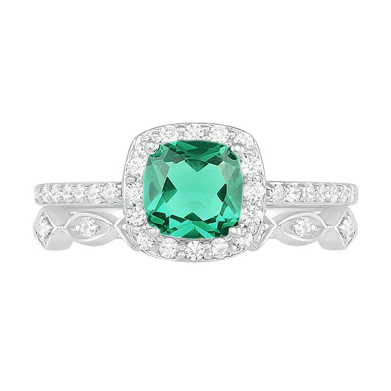 Fall in love with this sophisticated and elegant bridal set featuring a breathtaking gemstone and diamond combination. The 10K white gold engagement ring boasts a brilliant 6.0mm cushion-cut lab-created emerald...